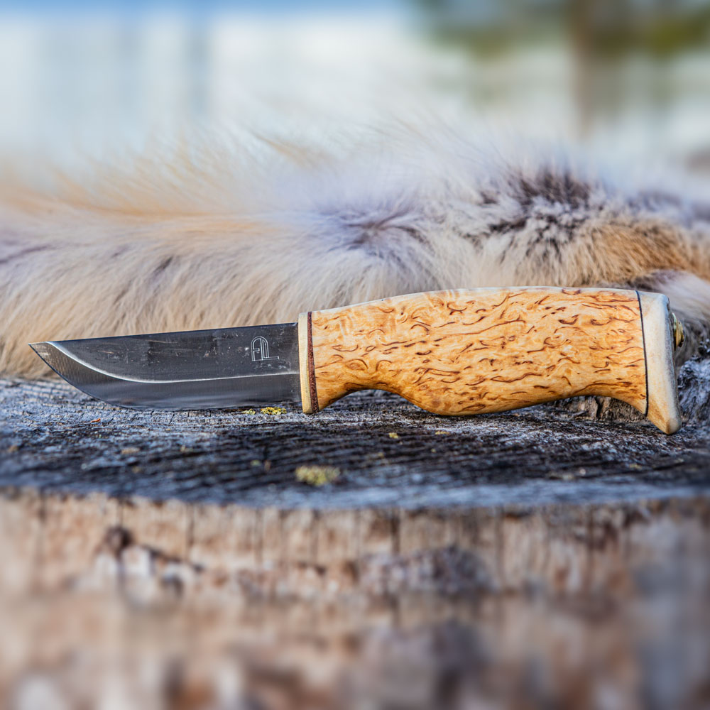 Rękojeść powstała z regionalnego drewna brzozy karelskiej o bardzo charakterystycznym układzie słojów. Drewno to od lat z powodzeniem stosowane jest jako materiał rękojeści klasycznych noży skandynawskich. Samo jej zakończenie natomiast, wykonane jest z poroża co nadaje jej jeszcze większej indywidualności. Ergonomiczne wyprofilowana rękojeść zapewnia wygodny chwyt.
