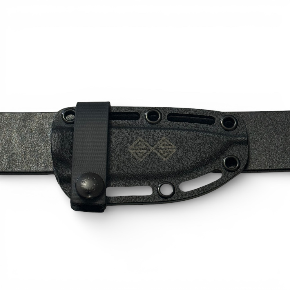 - Do przenoszenia i przechowywania noża służy pochwa uformowana z tworzywa Kydex. Pochwa startowo nie posiada uchwytu ale znajdują się w niej otwory, które można wykorzystać do zaplecenia paracordu lub podpięcia indywidualnego rodzaju mocowania jak np. jeden z dwóch klipsów marki UltiClip: 3.3 lub 2.2.