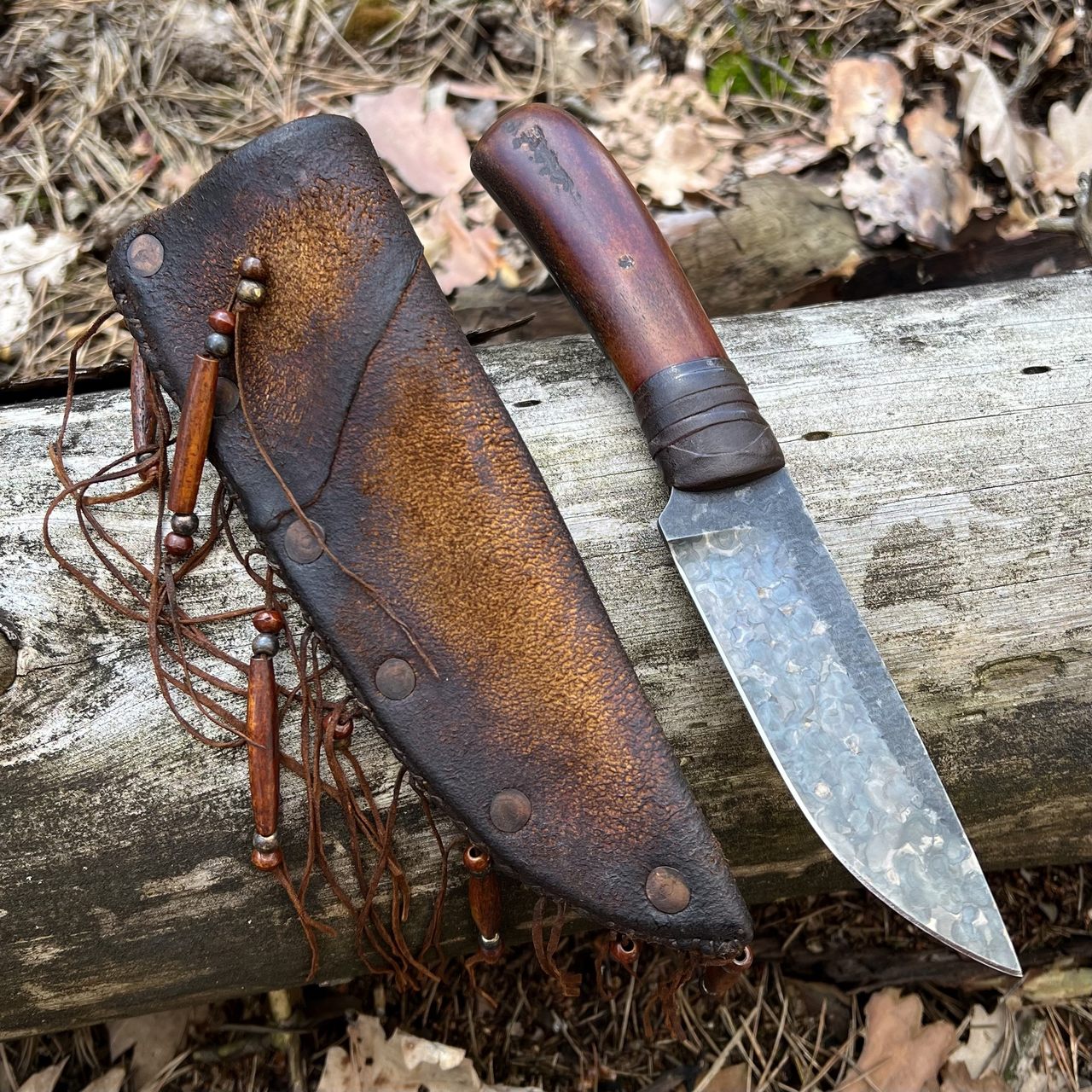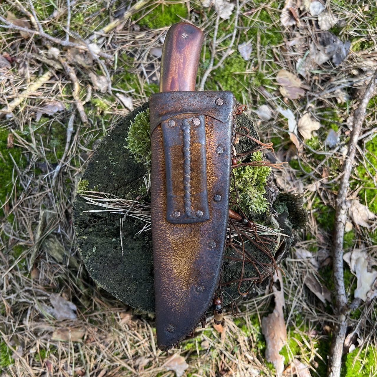 W komplecie z nożem otrzymujemy zaprojektowaną przez knifemakera, pieczołowicie wykończoną pochwę ze skóry naturalnej. Pochewka wykonana została z dwóch warstw: wewnętrznej wykonanej z juchtu bydlęcego oraz zewnętrznej z barwionej irchy jelenia. Bok pochwy przeszyty został grubymi nićmi oraz wzmocniony zaklepanymi gwoździami, pełniącymi również funkcję ozdobną. Krawędź tnąca nie styka się z gwoździami, ponieważ oddziela ją od nich skórzany dystans. Nie ma więc możliwości stępienia ostrza, a ryzyko przecięcia pochewki przy wkładaniu do niej noża jest ograniczone. Pochwę do pasa mocujemy za sprawą zamontowanej na odwrocie szlufki. Nóż w pochwie osadzony jest dość głęboko, co zabezpiecza go przed zgubieniem. Wystaje z niej jednak na tyle dużo, że nie ma trudności z jego wyjęciem. W procesie wykonawczym kolor pochwy został nadany farbami całkowicie naturalnymi.