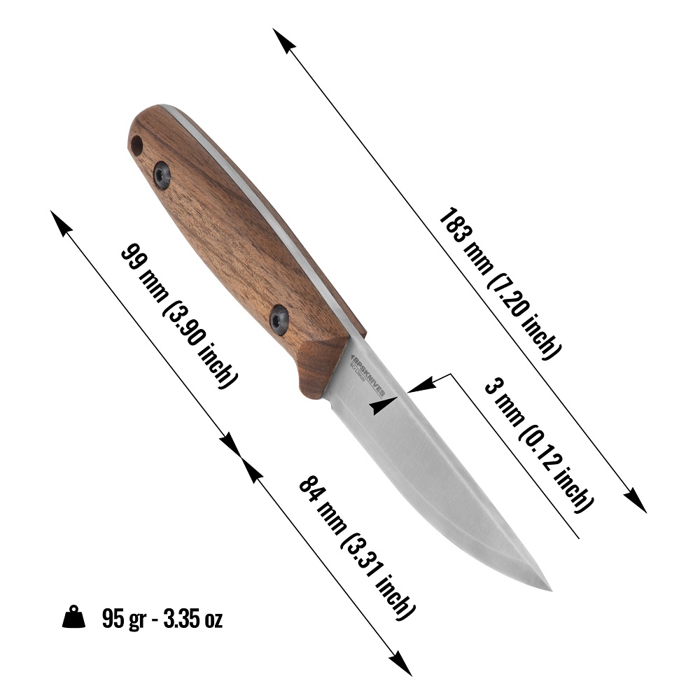 Nóż BPS Knives Finn Lite SSH to kompaktowe ostrze na użytek codzienny (EDC), biwaki, wycieczki górskie i szeroko pojęty outdoor. Inspirowany skandynawskimi nożami typu puukko posiada użytkowe 84 mm ostrze, które sprawdza się podczas przygotowywania żywności, drobnych prac obozowych oraz codziennych zadań tnących. Głownia wykonana ze stali nierdzewnej 8Cr13MoV zapewnia dobrą równowagę pomiędzy odpornością na korozję, trwałością krawędzi oraz łatwością ostrzenia, ergonomiczna rękojeść z drewna orzechowego gwarantuje pewny chwyt, a skórzana pochewka umożliwia wygodne przenoszenie noża w terenie.