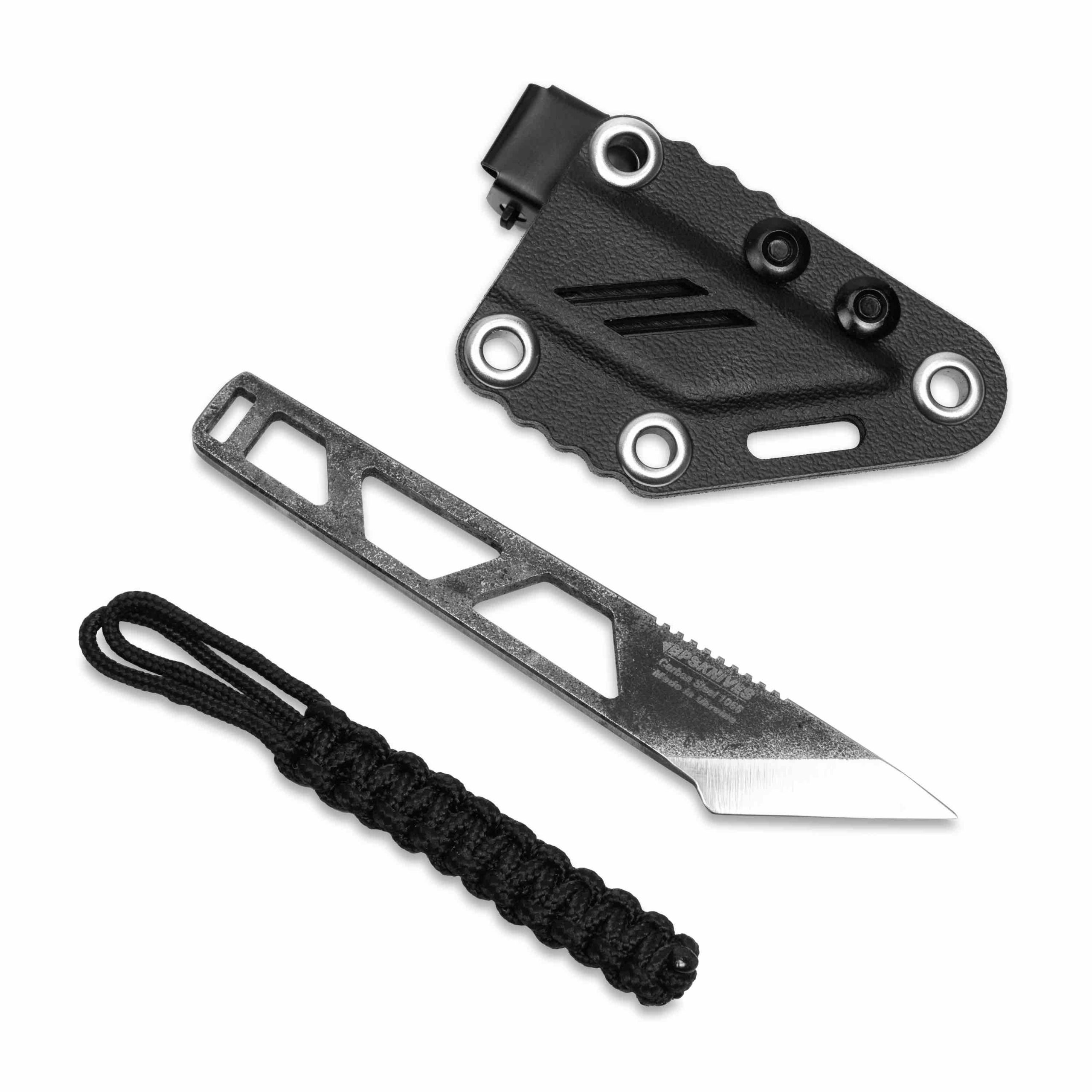 W zestawie z nożem otrzymujemy kaburę wykonaną z tworzywa sztucznego, dzięki której nóż możemy nosić na szyi jako neck knife. Pochwa posiada także piny przelotowe umożliwiające montaż w różnych miejscach (pas, plecak). Do zestawu dołączony jest także kawałek paracordu.