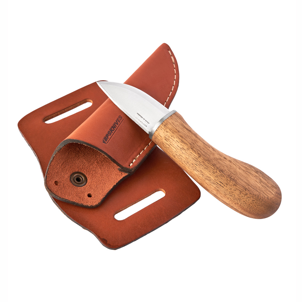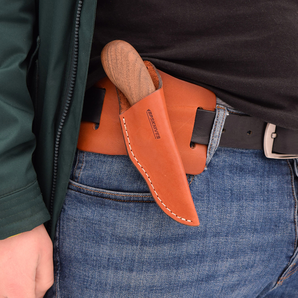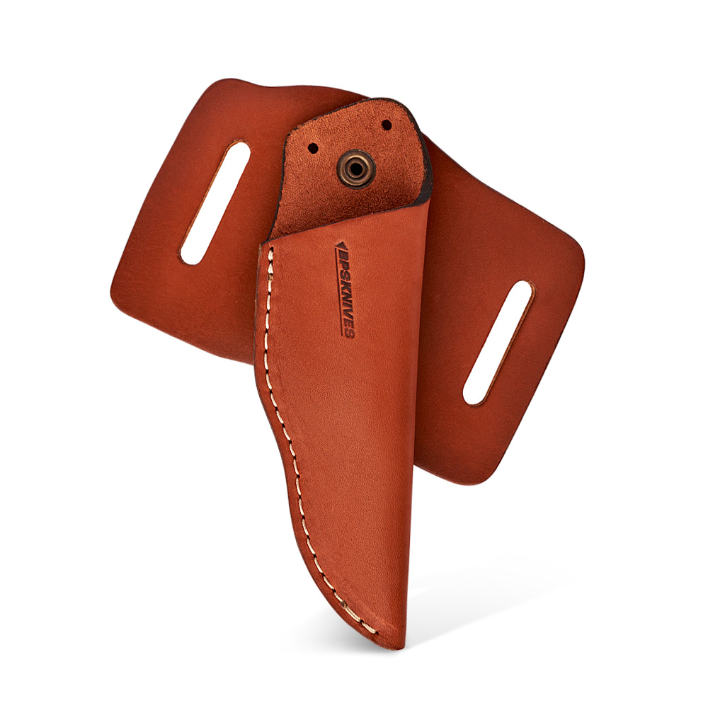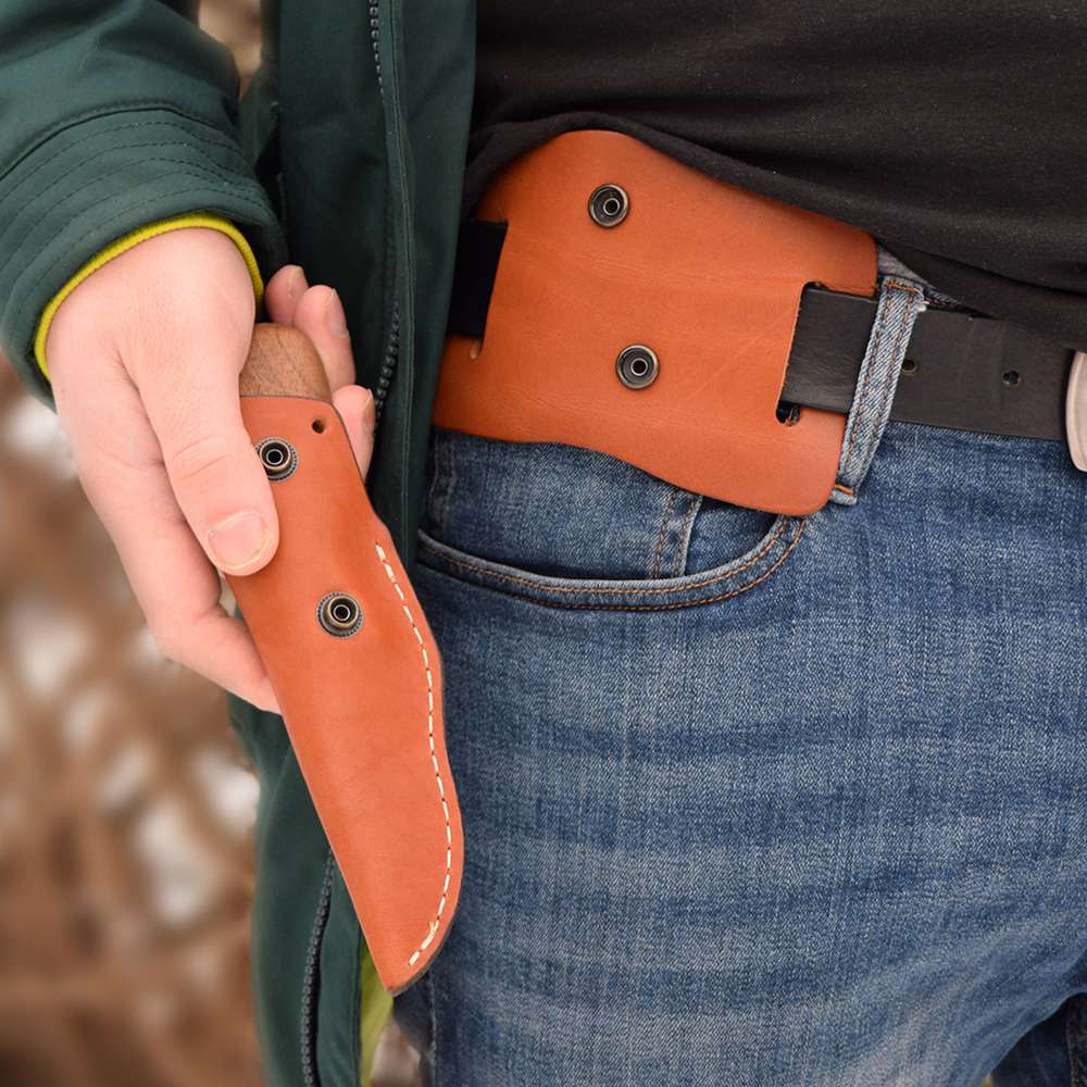 W zestawie z nożem otrzymujemy kaburę wykonaną ze skóry. Jest to klasyczne rozwiązanie pasujące stylem do narzędzia w niej się znajdującego. Drewno i skóra od zawsze stanowią idealne połączenie. Jasne przeszycia na skórze nadają jej bardzo oryginalnego wyglądu. Pochwa noża ma wysoki profil i chowa w sobie część rękojeści by lepiej zabezpieczać nóż przed wypadnięciem. Pochwa jest dwuczęściowa. Jeden element przewlekamy przez pasek spodni, drugi, trzymający sam nóż, mocowany jest do niego za pomocą zatrzasków, co sprawia, że możemy wyjąć sam nóż lub odpiąć nóż z pochwą.