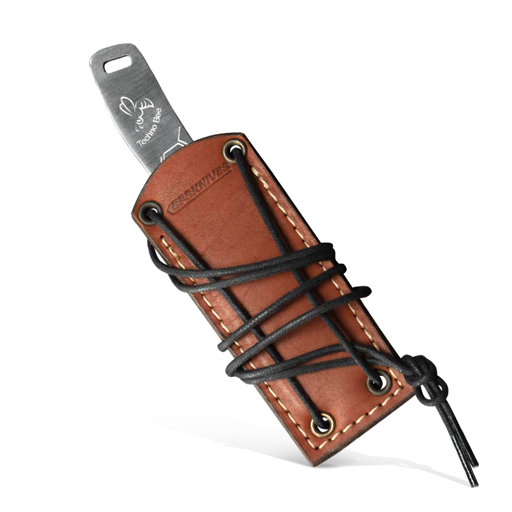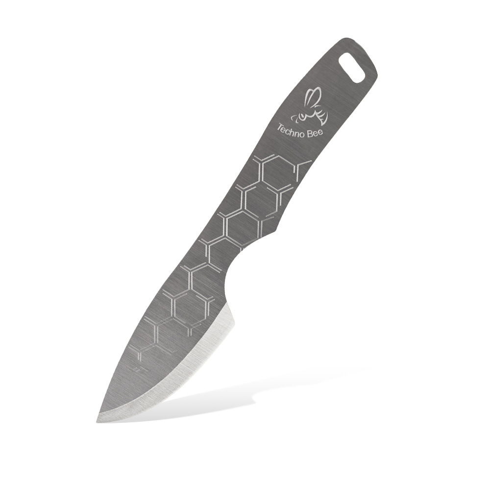 Nóż BPS Knives Techno Bee posiada roboczy profil ostrza drop point ze stali nierdzewnej 5Cr14MoV oraz szlif skandynawski a całość wykończona jest satyną. Rękojeść bez okładzin, zdobiona jest wzorami w kształcie plastra miodu. Na jej zakończeniu przewidziano otwór na linkę, paracord lub zawieszkę. W komplecie z nożem znajduje się zdobiona przeszyciami kabura z brązowej skóry na długiej lince.
