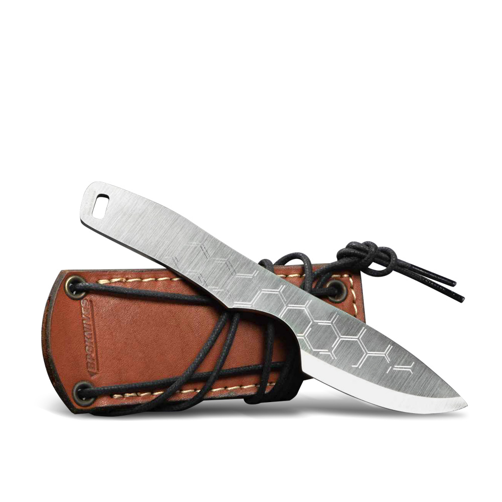 W zestawie z nożem otrzymujemy kaburę wykonaną ze skóry z linką, dzięki której nóż możemy nosić na szyi (neck knife). Pochwa posiada także piny przelotowe umożliwiające montaż w innych miejscach (pas, plecak).