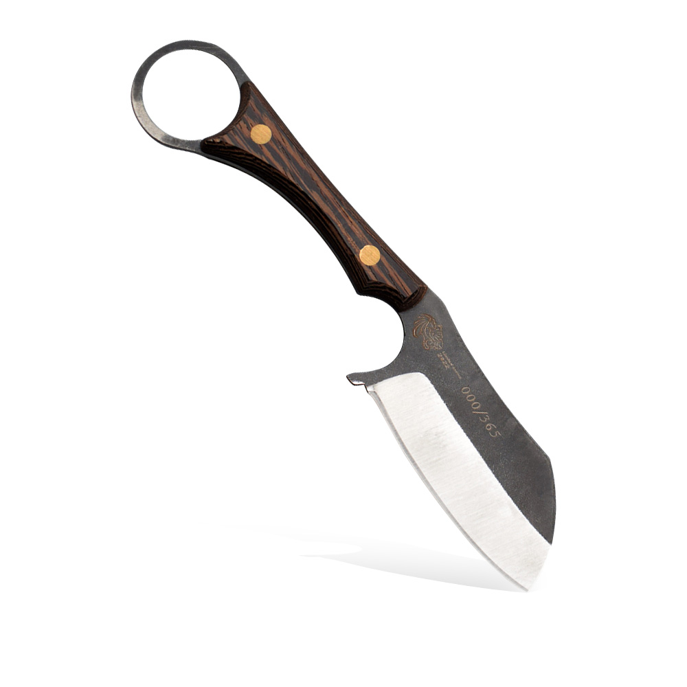 Nóż BPS Knives Tiger Limitowany 365 szt. posiada profil ostrza typu sheepsfoot ze szlifem płaskim. Ostrze ze stali nierdzewnej 5Cr14MoV ma satynowe wykończenie a rękojeść wykonana została z drewna wenge i zakończona otworem na palec w stylu karambit ułatwiającym wyjmowanie i chwyt noża. W komplecie z nożem znajduje się zdobiona przeszyciami kabura z brązowej skóry.