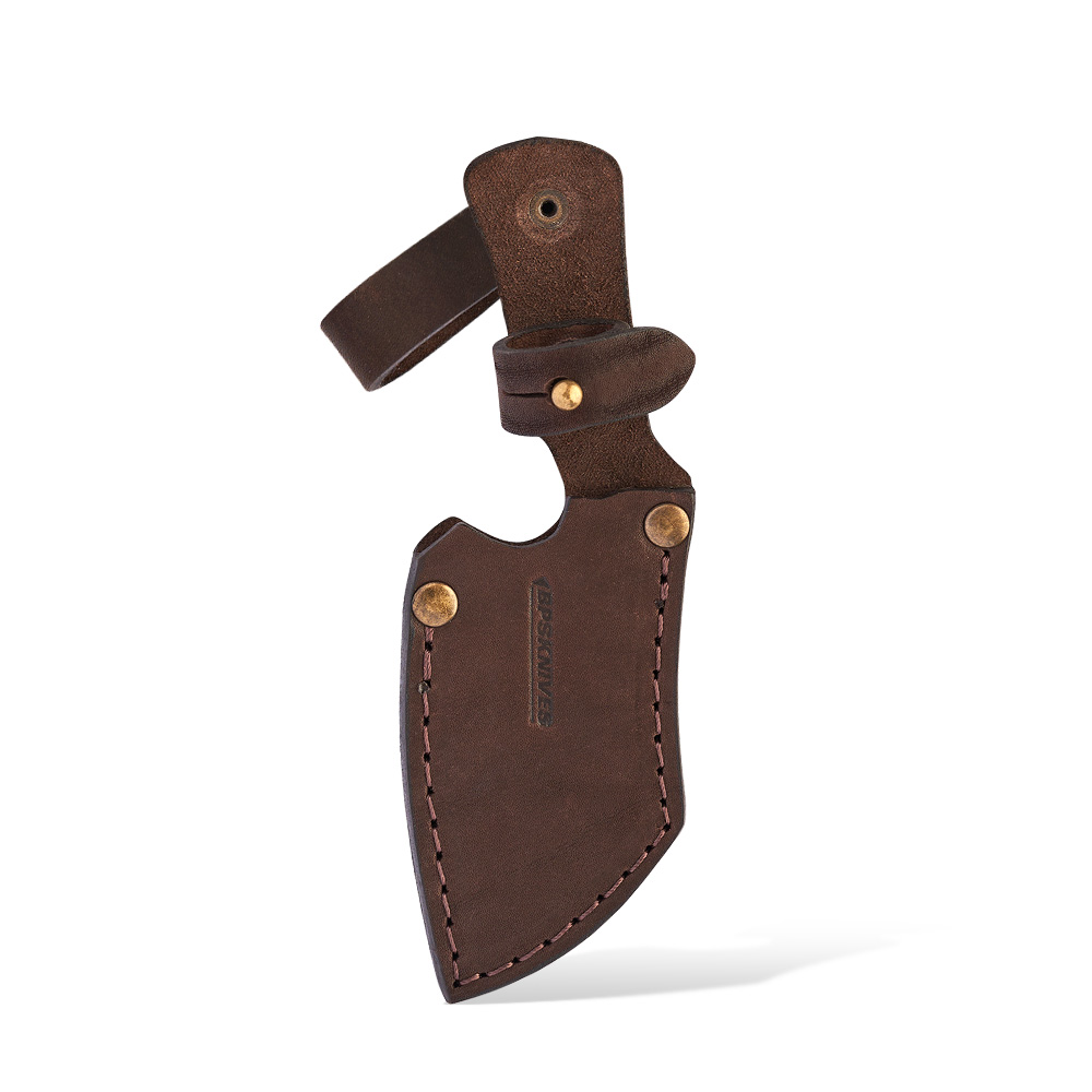 W zestawie z nożem otrzymujemy kaburę wykonaną ze skóry. Jest to klasyczne rozwiązanie pasujące stylem do narzędzia w niej się znajdującego. Drewno i skóra od zawsze stanowią idealne połączenie. Jasne przeszycia na skórze nadają jej bardzo oryginalnego wyglądu. Pochwa noża posiada dodatkowe zapięcie by zabezpieczać nóż przed wypadnięciem. Mocowana jest tradycyjnie do pasa czy plecaka w pozycji pionowej.