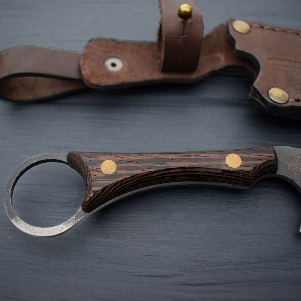 Okładziny rękojeści powstały z tropikalnego, bardzo twardego drewna wenge. Okładziny zostały przymocowane do konstrukcji za pomocą nitów. Zostały też zabezpieczone Olejem Duńskim co sprawia, że są odporne na wilgoć i brud. Pozbawione okładzin zakończenie rękojeści z otworem na palec, może przypominać rozwiązanie stosowane w nożach typu karambit i ma dokładnie to samo zastosowanie.