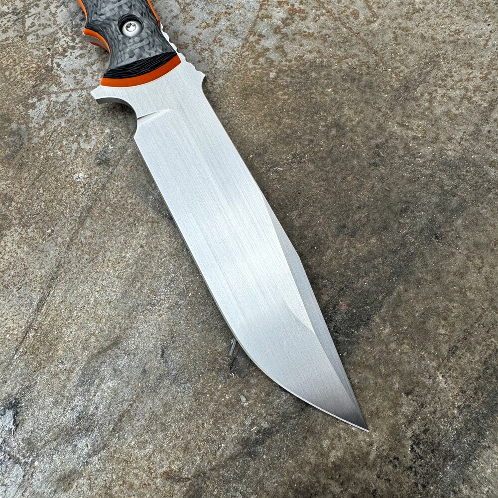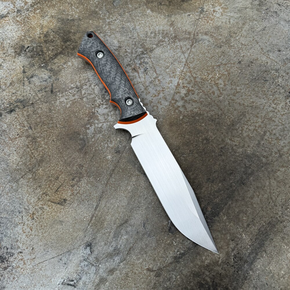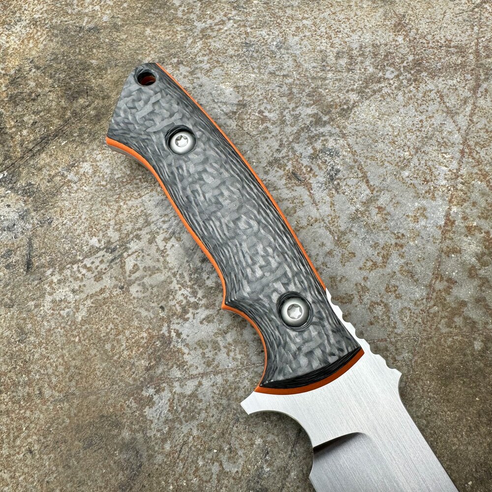 - Rękojeść: włókno węglowe (carbon fiber) + podwójne pomarańczowe przekładki (spacers) z G10