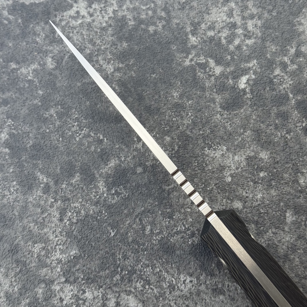 Okładziny rękojeści wykonane zostały z eleganckiego włókna węgłowego (carbon fiber). Materiał jest odporny na wilgoć, zmiany temperatury, większość rozpuszczalników i kwasów, posiada wysoką odporność na uszkodzenia mechaniczne. Okładki rękojeści zostały skręcone stalowymi śrubami o wykończeniu spójnym z wykończeniem ostrza (śruby M5 również wykończone ręcznie).