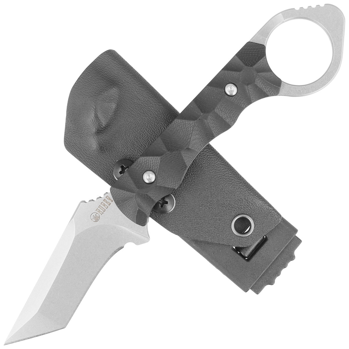 Rękojeść noża wykonana jest z czarnego G10, włókna szklanego prasowanego pod ciśnieniem z syntetyczną żywicą. Jest teksturowana, co poprawia pewność chwytu. Dodatkowo, rękojeść posiada głębokie pocięcie pod palec wskazujący oraz pierścień palcowy back ring / tail ring / ring pommel, co zapobiega wyślizgiwaniu się noża podczas trudnych zadań.