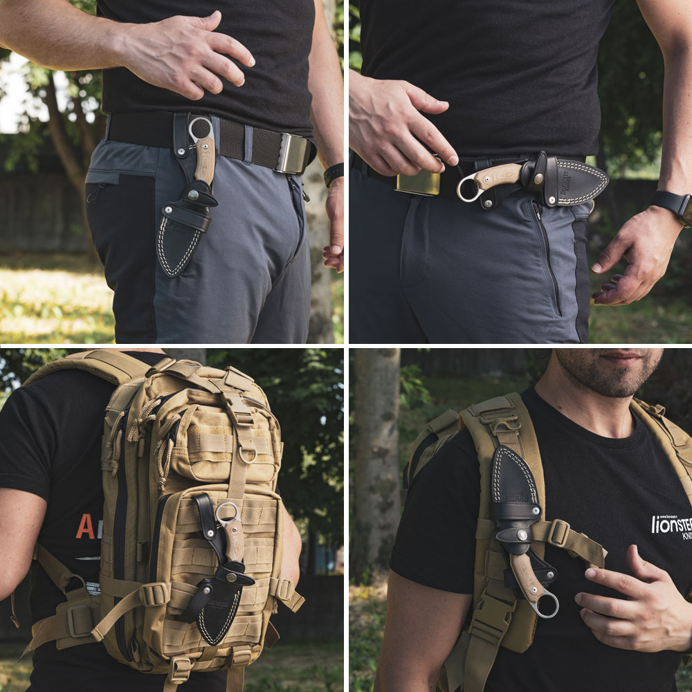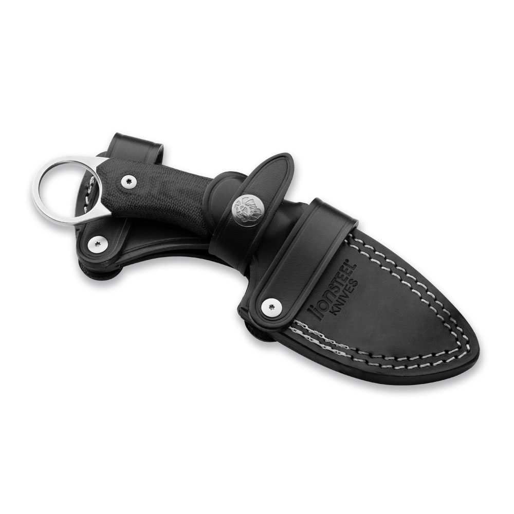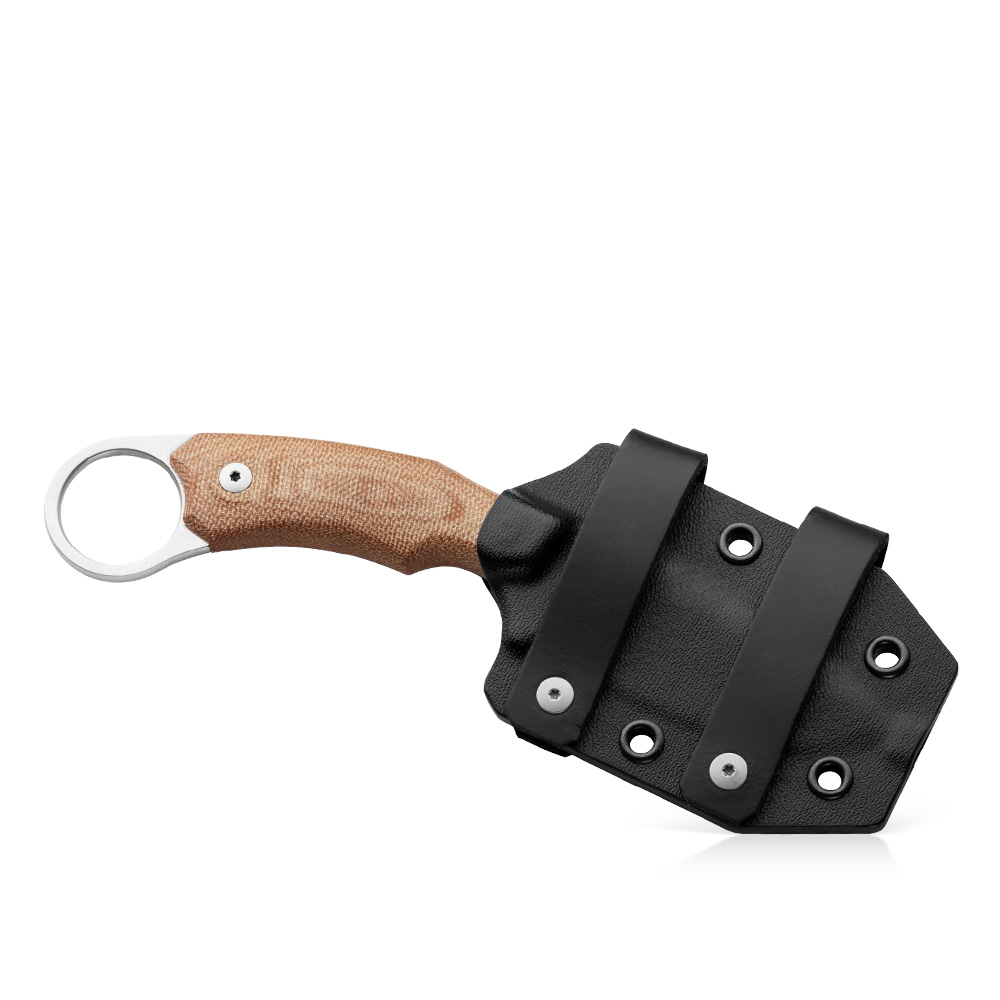 W zestawie z nożem otrzymujemy kaburę wykonaną z czarnej skóry. Posiada ona zapięcie wokół rękojeści noża z logo producenta zabezpieczające przed przypadkowym wysunięciem a także zestaw pasków (szlufek) do przenoszenia noża w każdej właściwie pozycji (pionowa, pozioma, odwrócona). Jest ona również kompatybilna z systemami MOLLE. Do zestawu dołączone jest narzędzie (KKR8), które pozwala na dowolną konfigurację mocowań pochwy i personalizację noszenia samego noża. Pochwa została gustownie ozdobiona jasnymi, mocnymi szwami oraz tłoczonym logo producenta.