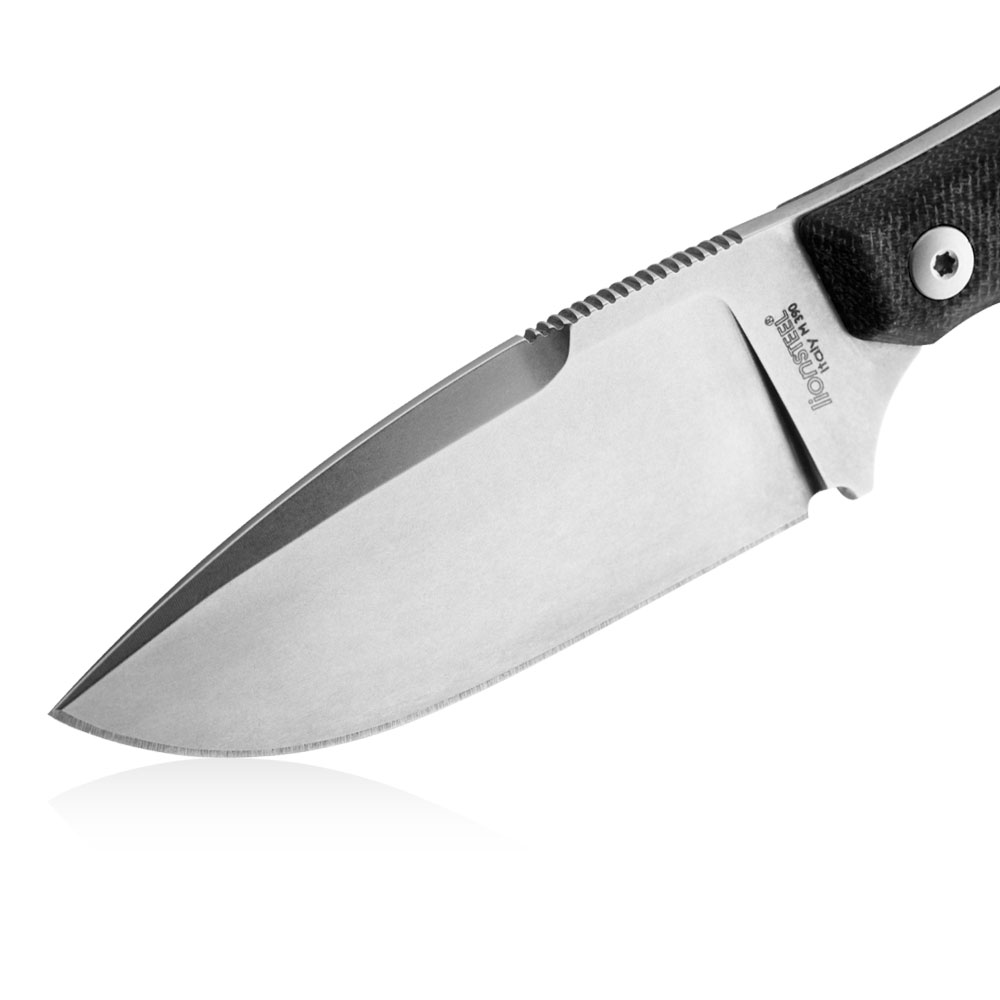 Lion STEEL H2 Stone Washed M390 Black G10 to nóż o konstrukcji full tang, wykonany z jednego odcinka stali przebiegającego przez całą długość i szerokość rękojeści, do której przymocowano okładki z jednego kawałka czarnego kompozytu G10. Cały nóż wykonany został zatem ze stali proszkowej M390. Jest to jedna z kilku stali dostępnych na rynku znajdujących się w absolutnym topie jakościowym materiałów służących do produkcji noży premium. Najlepsze jej właściwości uzyskuje się poprzez właściwe wykonanie procesu hartowania, w którym bezbłędnie muszą być przeprowadzone 3 etapy: utwardzanie, chłodzenie kriogeniczne (wymrażanie) i odpuszczanie. Właściwie przygotowane ostrze z M390 jest ekstremalnie wytrzymałe na przeciążenia, niezwykle długo pozostaje ostre (bardzo wolno się ściera) i ma doskonałe właściwości antykorozyjne.
