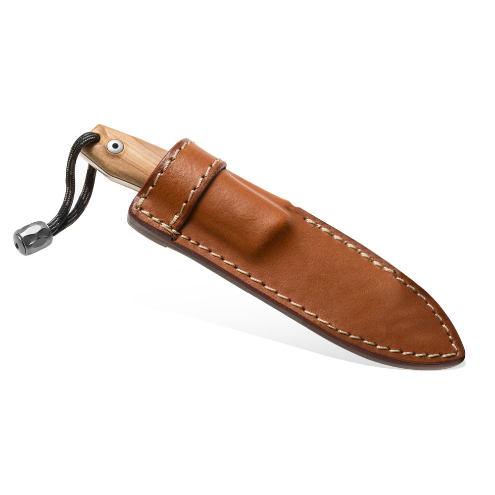 W zestawie z nożem otrzymujemy kaburę wykonaną ze skóry. Jest to klasyczne rozwiązanie pasujące stylem do narzędzi w niej się znajdującego. Drewno i skóra od zawsze stanowią idealne połączenie. Jasne przeszycia na skórze nadają jej bardzo oryginalnego wyglądu. Pochwa noża ma wysoki profil i chowa w sobie część rękojeści by lepiej zabezpieczać nóż przed wypadnięciem. Mocowana jest tradycyjnie do pasa w pozycji pionowej.