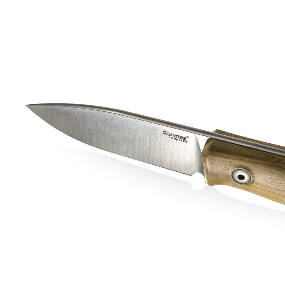 LionSTEEL M1 Olive Wood M390 by Molletta to nóż o konstrukcji full tang, wykonany z jednego odcinka stali przebiegającego przez całą długość i szerokość rękojeści, do której przymocowano okładki z drewna oliwkowego (Olive Wood). Cały nóż wykonany został zatem ze stali proszkowej M390. Jest to jedna z kilku stali dostępnych na rynku znajdujących się w absolutnym topie jakościowym materiałów służących do produkcji noży premium. Najlepsze jej właściwości uzyskuje się poprzez właściwe wykonanie procesu hartowania, w którym bezbłędnie muszą być przeprowadzone 3 etapy: utwardzanie, chłodzenie kriogeniczne (wymrażanie) i odpuszczanie. Właściwie przygotowane ostrze z M390 jest ekstremalnie wytrzymałe na przeciążenia, niezwykle długo pozostaje ostre (bardzo wolno się ściera) i ma doskonałe właściwości antykorozyjne.
