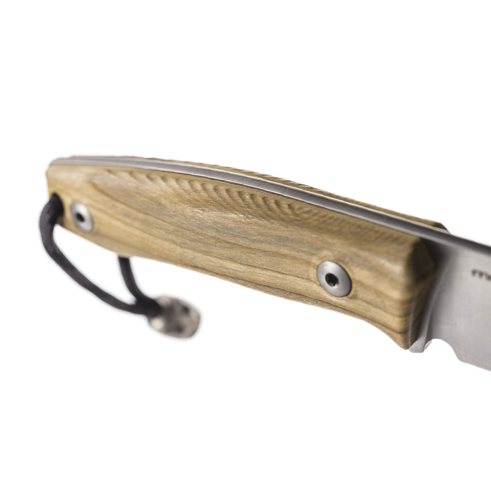 Rękojeść noża wykonana została z ergonomicznie wyprofilowanego drewna oliwkowego (Olive Wood) i przytwierdzona do stalowej konstrukcji za pomocą śrub. Pozwala to stworzyć bardzo wygodny chwyt a dotyk drewnianych okładek potęguje wrażenie solidności noża. Nie zapomniano też o otworze na linkę. Można go wykorzystać, w celu dodatkowego zabezpieczenia noża przed zgubieniem lub na podpięcie ozdobnego koralika poprawiającego chwytność całości, który w tym przypadku został dołączony do zestawu.