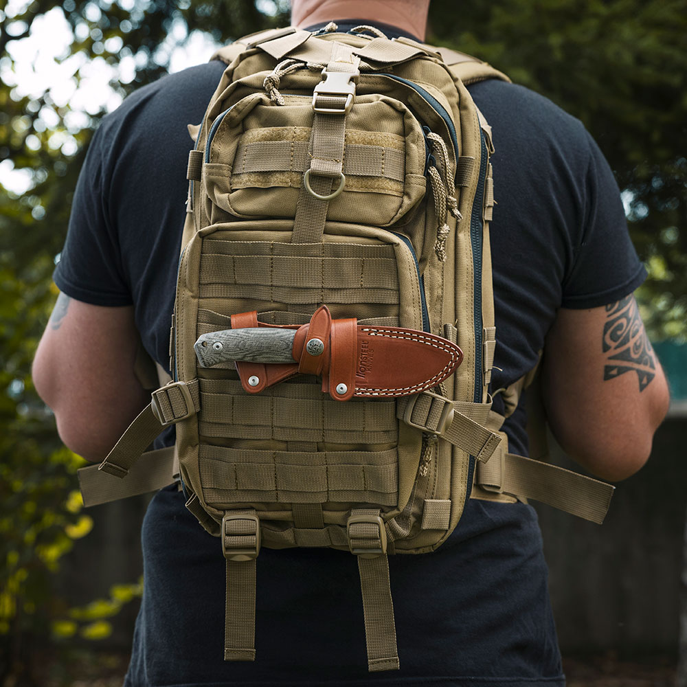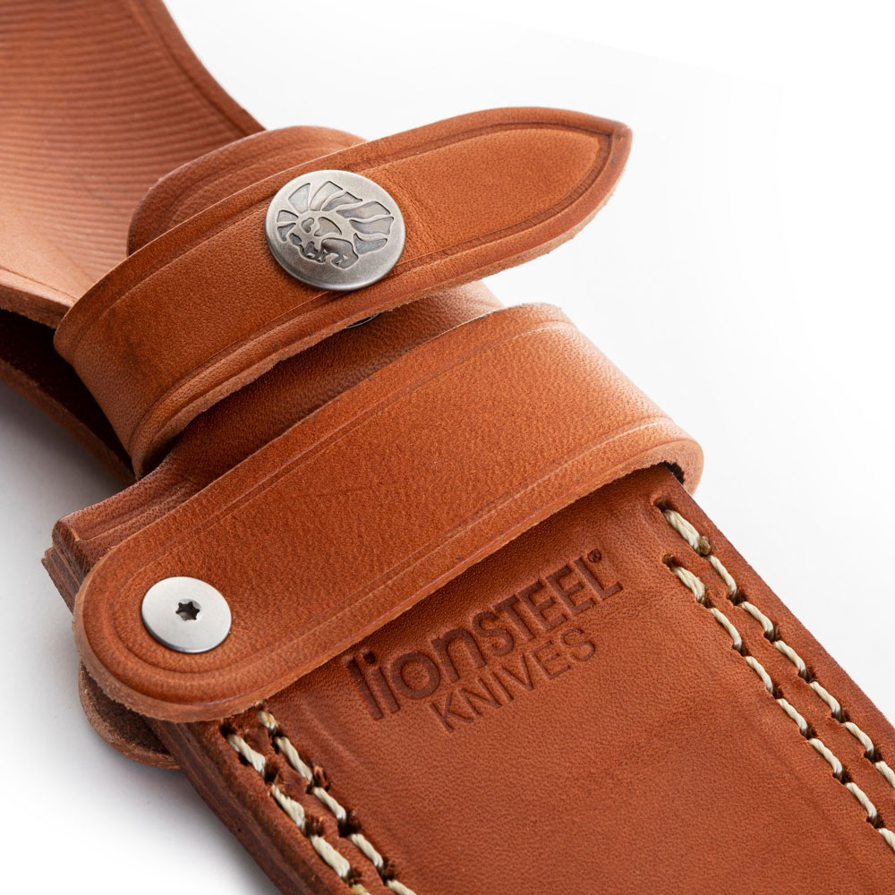 W zestawie z nożem otrzymujemy kaburę wykonaną z brązowej skóry. Posiada ona zapięcie wokół rękojeści noża z logo producenta zabezpieczające przed przypadkowym wysunięciem a także zestaw pasków (szlufek) do przenoszenia noża w każdej właściwie pozycji (pionowa, pozioma, odwrócona). Jest ona również kompatybilna z systemami MOLLE. Pochwa została gustownie ozdobiona jasnymi, mocnymi szwami oraz tłoczonym logo producenta.