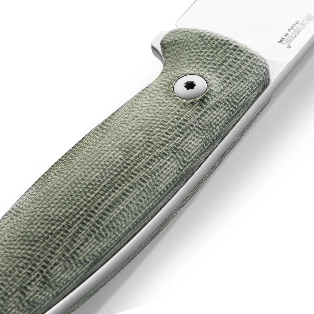 Nóż LionSTEEL M2M Satin M390 Canvas Micarta Green posiada konstrukcję full tang, wykonany jest z jednego odcinka stali przebiegającego przez całą długość i szerokość rękojeści, do której przymocowano okładki z zielonej micarty. Cały nóż wykonany został zatem ze stali proszkowej M390. Jest to jedna z kilku stali dostępnych na rynku znajdujących się w absolutnym topie jakościowym materiałów służących do produkcji noży premium. Najlepsze jej właściwości uzyskuje się poprzez właściwe wykonanie procesu hartowania, w którym bezbłędnie muszą być przeprowadzone 3 etapy: utwardzanie, chłodzenie kriogeniczne (wymrażanie) i odpuszczanie. Właściwie przygotowane ostrze z M390 jest ekstremalnie wytrzymałe na przeciążenia, niezwykle długo pozostaje ostre (bardzo wolno się ściera) i ma doskonałe właściwości antykorozyjne.