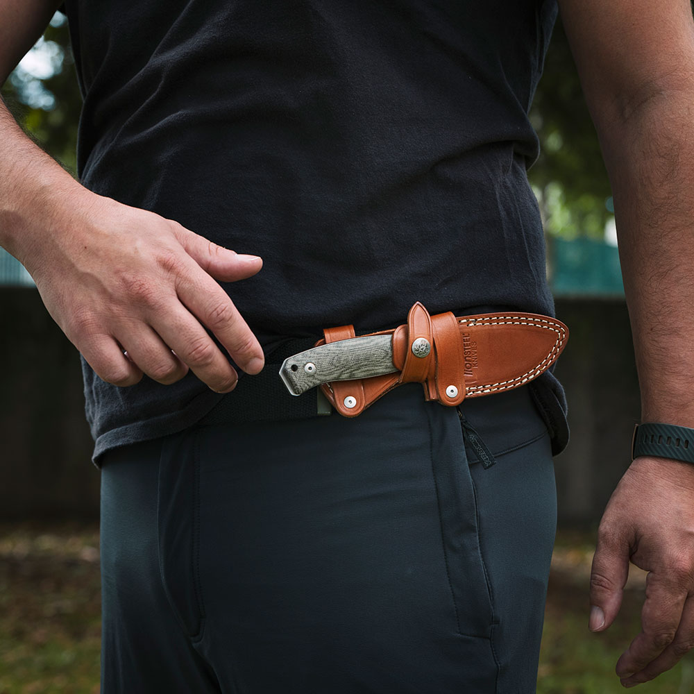 Rękojeść noża wykonana została z micarty (Canvas Micarta Green) i przytwierdzona do stalowej konstrukcji za pomocą śrub. Pozwala to stworzyć bardzo wygodny chwyt. Rękojeść posiada ergonomiczny profil i wydatne podcięcie pod palec wskazujący, które zapobiega zsuwaniu się dłoni na krawędź tnącą podczas pracy. Dodatkowo drewno posiada teksturowanie, które znacząco poprawia trakcję i zapobiega ślizganiu się dłoni. Rękojeść zakończona stalowym, będącym integralną częścią konstrukcji zbijakiem do szyb lub młotkiem, który dodatkowo może współpracować z krzesiwem, ponieważ zakończono go krawędziami o kącie 90 stopni.