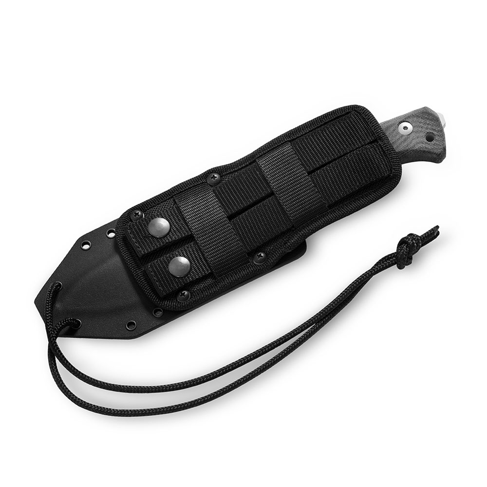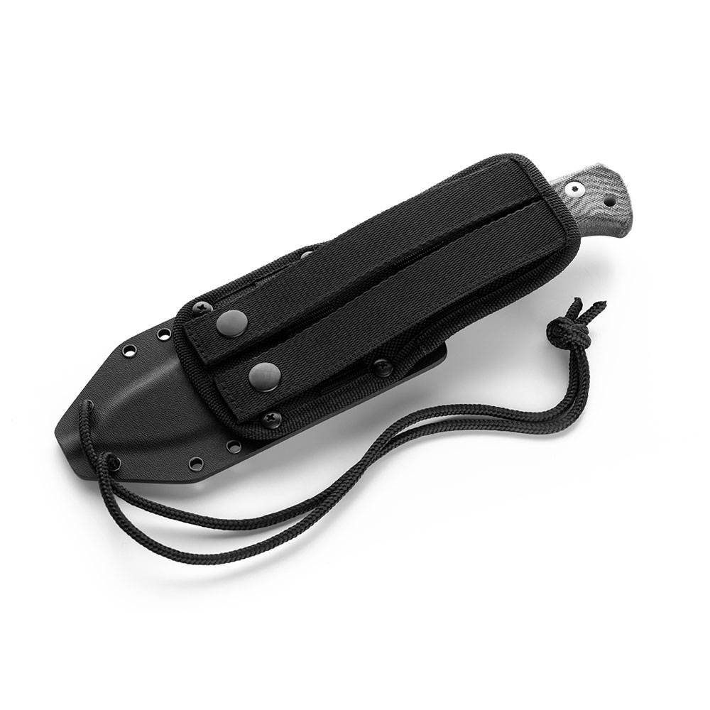 W zestawie z nożem otrzymujemy kaburę tekstylno-Kydex’ową. Kydex cechuje się wysoką odpornością na uderzenia, zarysowania, charakteryzuje się niską chłonnością wilgoci, odpornością na różnorodne warunki atmosferyczne oraz wiele środków chemicznych. Kabury z niego wykonane użytkujemy wygodnie i długotrwale. Kabura zaopatrzona została w piny przelotowe, do których można przypiąć np. uchwyt na krzesiwo (nie znajduje się w zestawie) lub użyć ich do jej zamocowania na plecaku. Tekstylna, elastyczna część kabury, wyposażona została w pasy z zatrzaskami pozwalające montować nóż do systemów MOLLE. Całość konstrukcji kabury pozwala nosić nóż w różnych pozycjach (poziom, pion a nawet rękojeścią w dół dzięki zastosowaniu dodatkowego zatrzasku wokół niej).