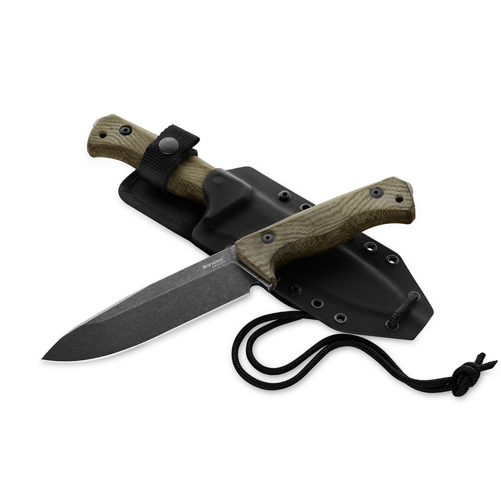 Nóż LionSTEEL T6B Green Canvas Old Black K490 by Molletta to posiada roboczy profil ostrza typu drop point ze szlifem płaskim. Ostrze ze stali K490 posiada czarne wykończenie (PVD + stonewash) a rękojeść typu Solid®, w którym to rozwiązaniu włoski producent się specjalizuje wykonano z zielonej micarty (green canvas). W komplecie z nożem znajduje się kabura z tworzywa kydex pozwalająca na przenoszenie w poziomie i w pionie (kompatybilna jak wspomniano wyżej z rozwiązaniami typu Molle).