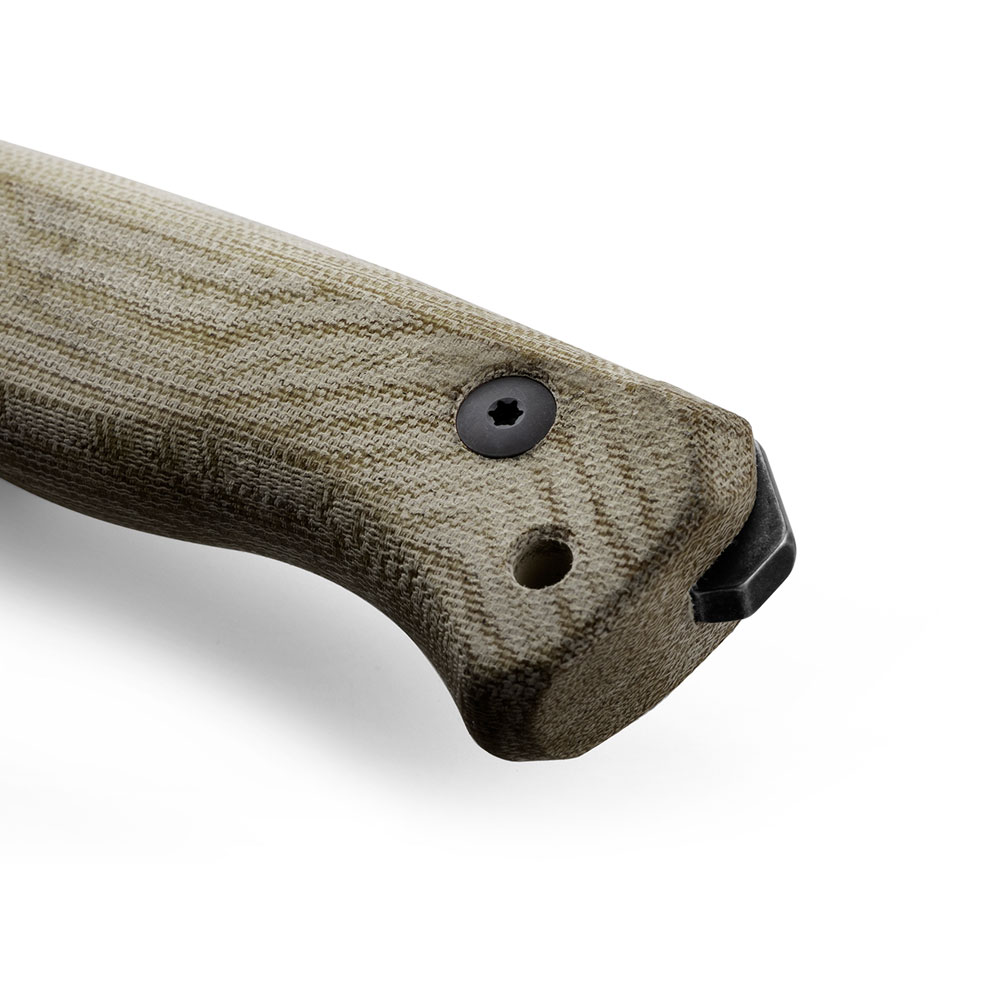 Rękojeść noża wykonana została w technologii Solid® z jednego kawałka micarty (green canvas) i przytwierdzona do stalowej konstrukcji za pomocą śrub. Pozwala to stworzyć bardzo wygodny chwyt zwłaszcza dla palców, które nie napotykają żadnych łączeń czy nierówności podczas mocnego zaciśnięcia. U nasady rękojeści znajduje się jelec, który zapobiega zsuwaniu się dłoni na krawędź tnącą podczas pracy. Rękojeść zakończona jest wystającym poza jej obrys stalowym elementem konstrukcji, mogącym służyć jako zbijak lub młotek. Nie zapomniano też o otworze na linkę. Można go wykorzystać, w celu dodatkowego zabezpieczenia noża przed zgubieniem lub na podpięcie ozdobnego koralika poprawiającego chwytność całości.