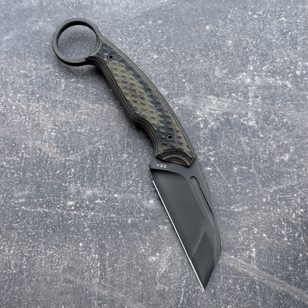 - Prezentowany Claw posiada ostrze ze stali o świetnej wytrzymałości Vanadis 23 w czarnej powłoce DLC. Ostrze posiada innowacyjny podwójny szlif rowkowy (Double Groove Grind) oraz obustronne zbrocze (fuller).