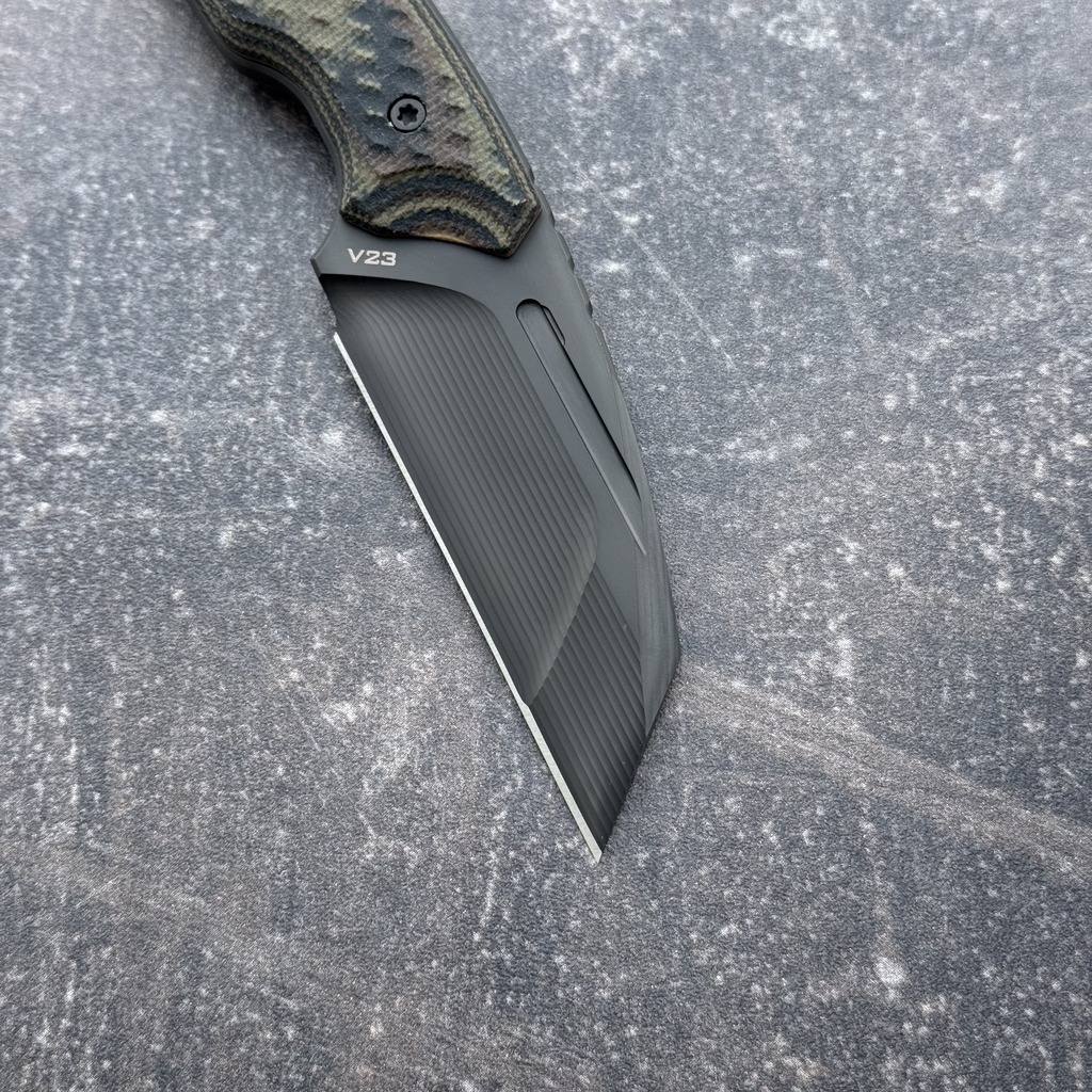 - Rękojeść: Camo canvas Micarta + coyote G10 (liners)
