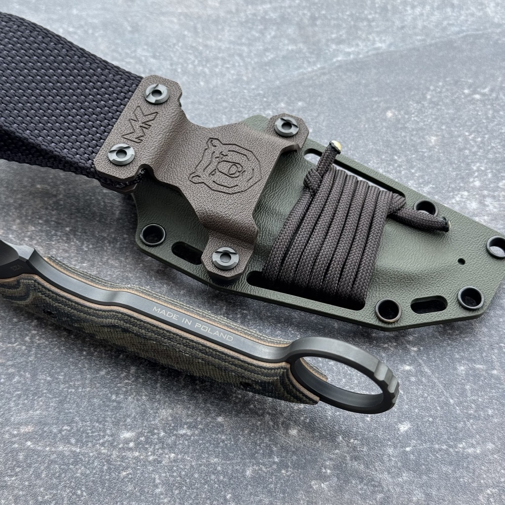 - Pokrowiec: Kabura Kydex w kolorze OD green z brązową klamrą (Earth Brown) oraz nylonową przelotką