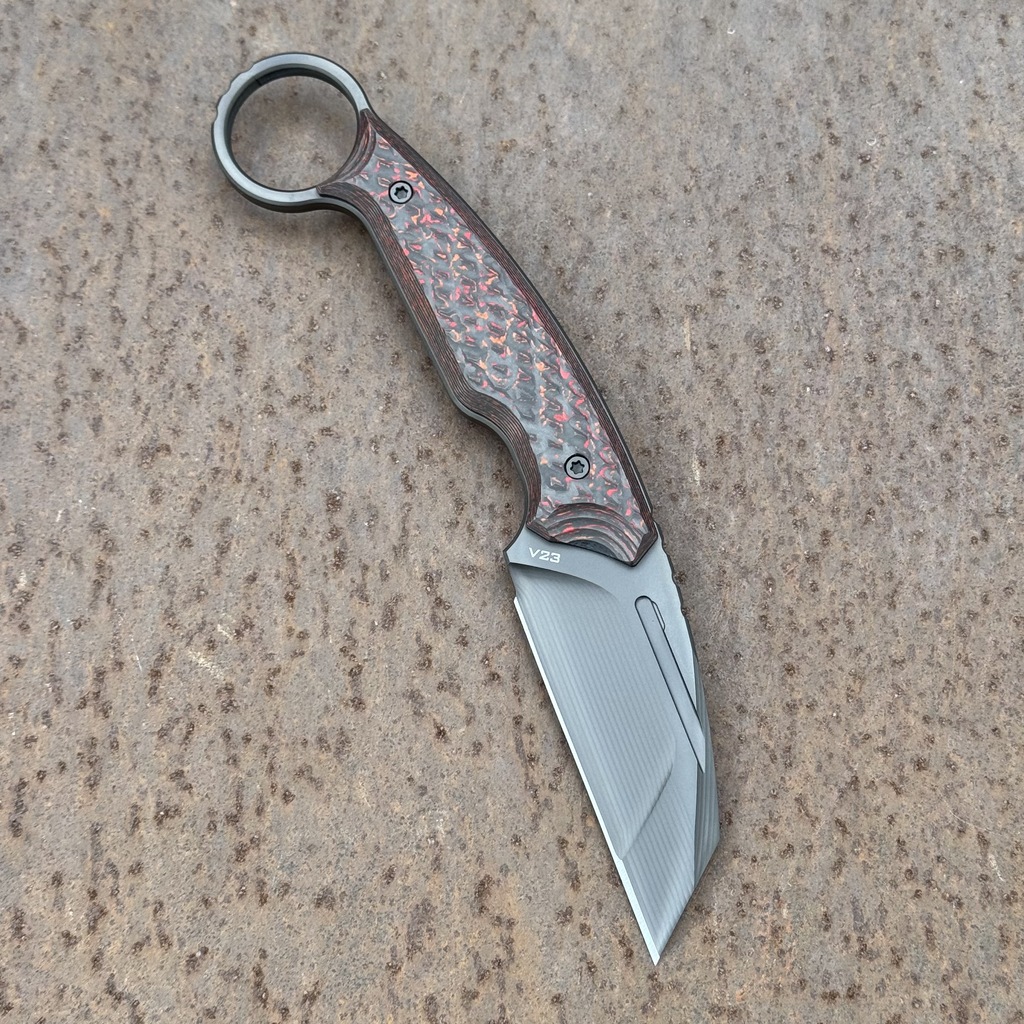 - linia krawędzi biegnie na tej samej płaszczyźnie co linia rękojeści, która nie jest zakrzywiona jak w klasycznych karambitach a co najwyżej łukowata od strony grzbietowej. To powoduje że rękojeść można chwycić pod różnym kątem i z każdej strony i wygodnie używać. Najbardziej klasyczny chwyt chociażby, gdzie cała dłoń zaciska rękojeść a kciuk przebiega wzdłuż grzbietu umożliwia chociażby struganie, które w przypadku tradycyjnego karambita byłoby mocno utrudnione,
