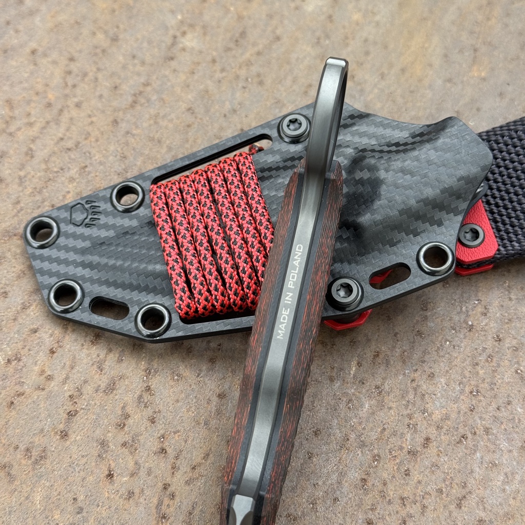 - Rękojeść: włókno węglowe Mars Valley FatCarbon + czarne G10 (black liners)