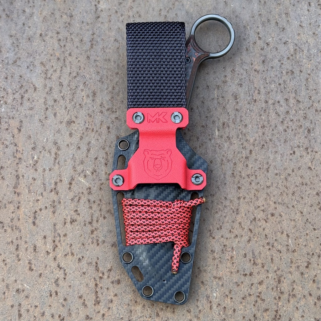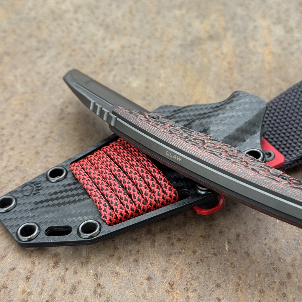 - W komplecie znajduje się pochwa z tworzywa Holstex o wzorze włókna węglowego (Black Carbon Holstex) z czerwoną klamrą Kydex oraz tekstylną przelotką do przenoszenia, po raz pierwszy w historii w tym modelu. Kabura posiada ikonograficzne grawery charakterystyczne dla serii „Fear The Bear”