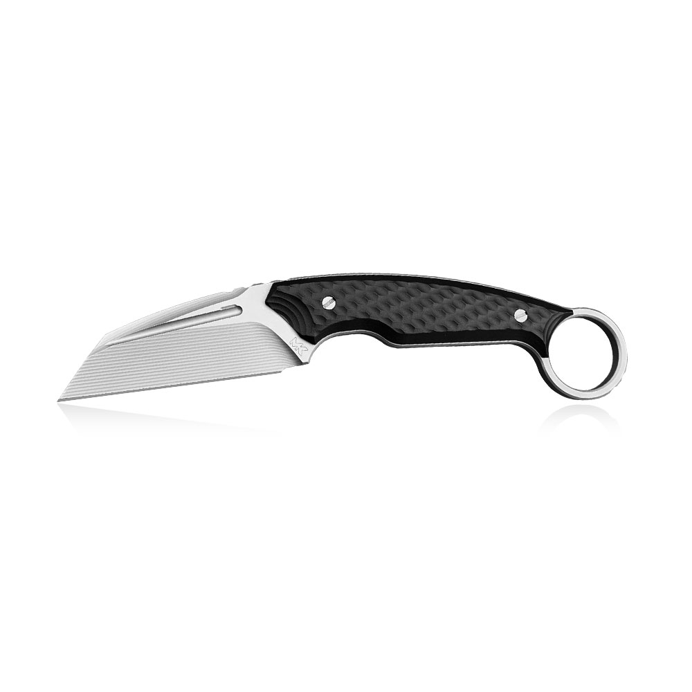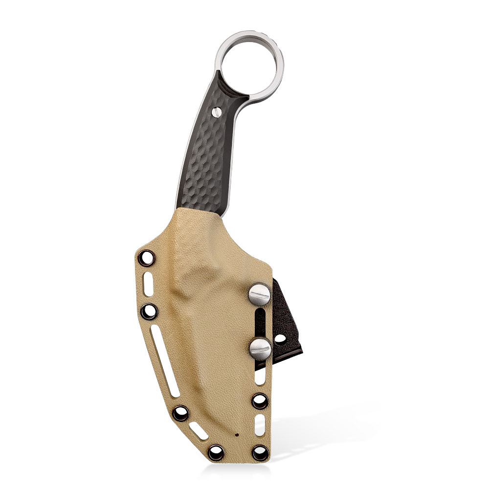 Rękojeść noża wraz z charakterystycznym dla karambitów otworem na palec jest dopasowana do każdej dłoni, niezależnie od jej rozmiaru. Ergonomicznie zaprojektowany owal rękojeści bardzo dobrze dopasowuje się i pewnie leży w dłoni, również dzięki podcięciu na palec, które dodatkowo zapobiega zsunięciu się ręki na ostrze. Zaokrąglony wystający z każdej strony rękojeści grzbiet sprawia, że trzymanie noża jest komfortowe i pewne.