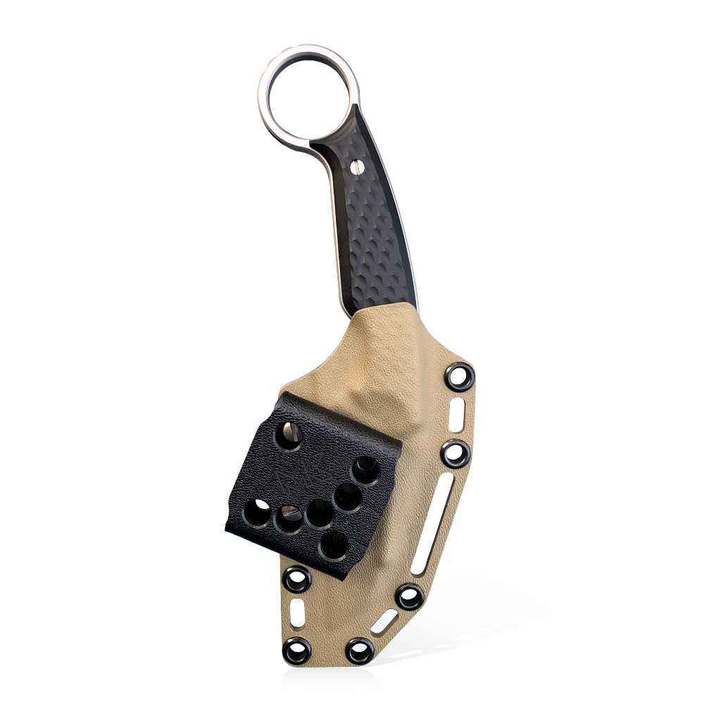 Nóż posiada kaburę z ręcznie formowanego tworzywa kydex cechującego się wysoką odpornością na uderzenia, zarysowania, charakteryzującego się niską chłonnością wilgoci, odpornego na różnorodne warunki atmosferyczne oraz wiele środków chemicznych.