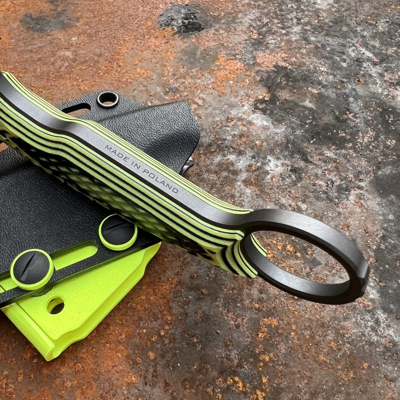 - Rękojeść: kompozyt G10 – połączenie żółtego i czarnego