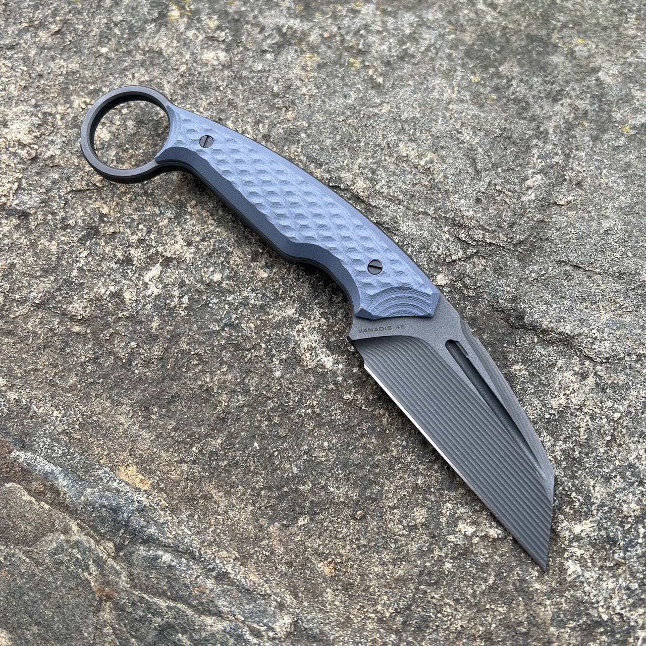 Prezentowany egzemplarz noża Claw wykonany został z jednego odcinka stali Vanadis 4 Extra. Jest to nóż o konstrukcji full-tang, gdzie stal przebiega przez całą długość i szerokość rękojeści do której przytwierdzone zostały okładki. Vanadis 4 Extra jest to ekstremalnie twarda i wytrzymała stal odporna na przeciążenia, ścieranie i wyszczerbianie się, znana ze swojej niesamowitej ostrości. Stal przez wzgląd na swoje właściwości jest często używana przy produkcji noży taktycznych przeznaczonych do pracy w różnorodnych, często ekstremalnych warunkach. Nóż został powleczony czarną tytanową powłoką PVD wzmacniającą dodatkowo stal i poprawiającą właściwości antykorozyjne. Powłoka ma właściwości antyrefleksyjne.