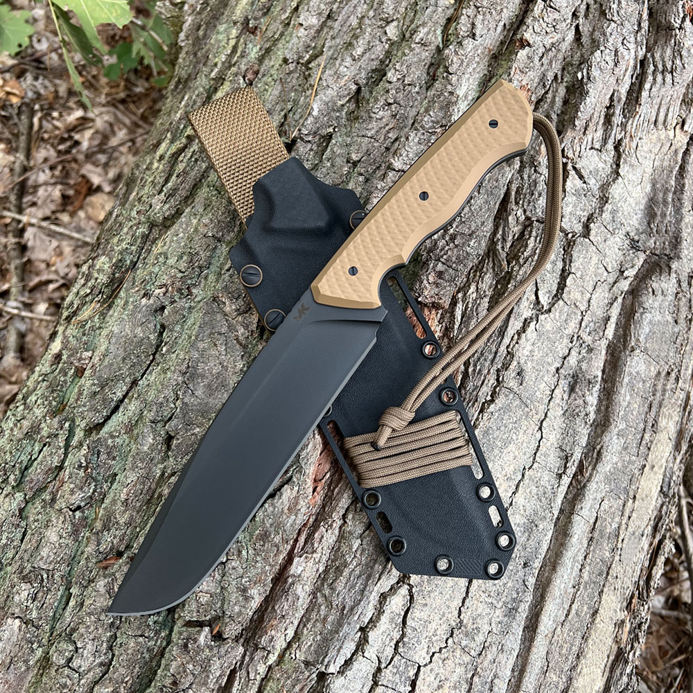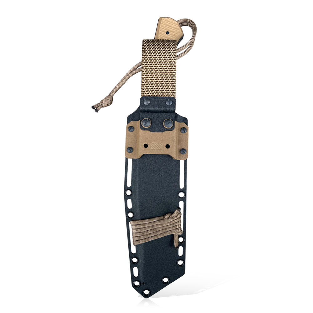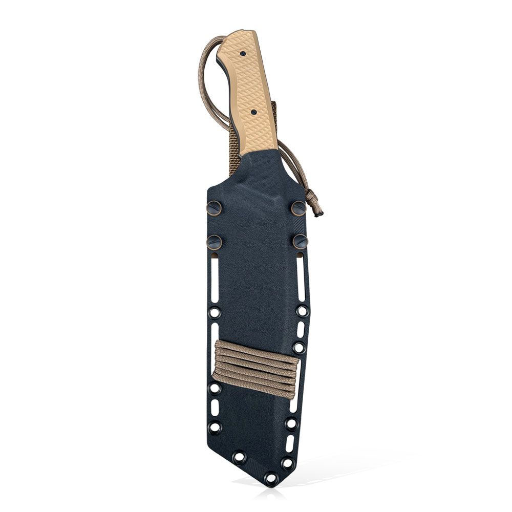 Nóż posiada kaburę z ręcznie formowanego tworzywa Kydex cechującego się wysoką odpornością na uderzenia, zarysowania, charakteryzującego się niską chłonnością wilgoci, odpornego na różnorodne warunki atmosferyczne oraz wiele środków chemicznych. W prezentowanym modelu kabura zrobiona została z materiału w dobranym przez wykonawce kolorze oraz uzupełniona dobranymi do projektu dodatkami kolorystycznymi.