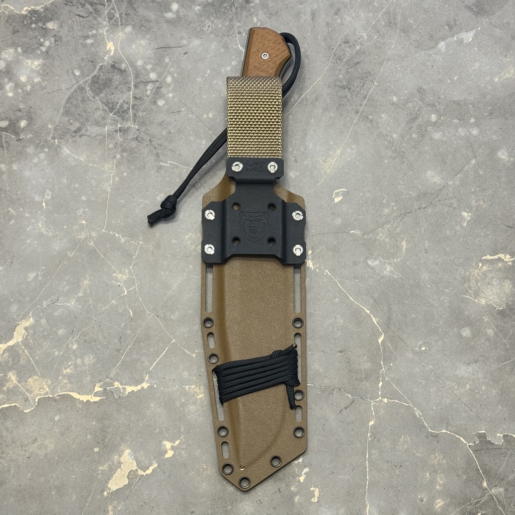 Napisz pierwszą opinię o „Nóż MK Knives & Tools Crowbar “Fear The Bear” Bead Blasted Elmax Natural Canvas Micarta/Black G10 Coyote Kydex”