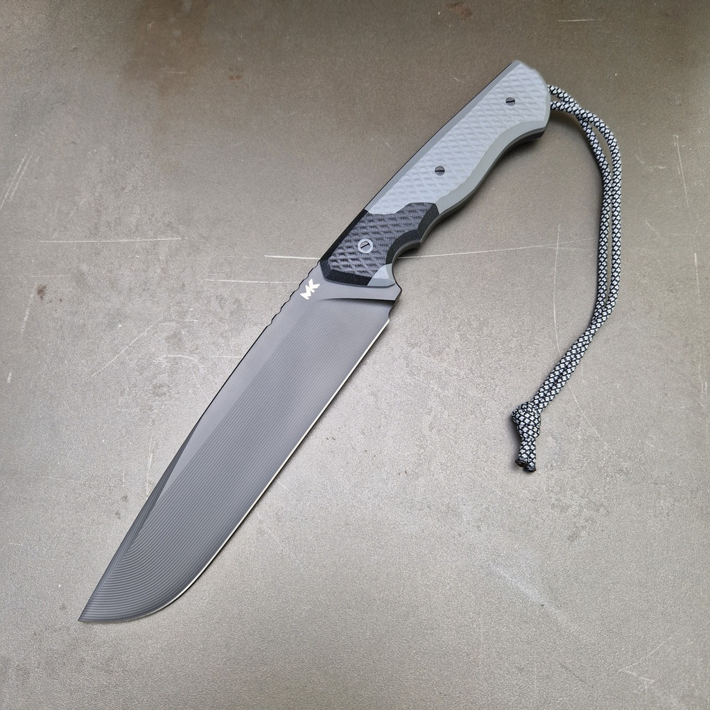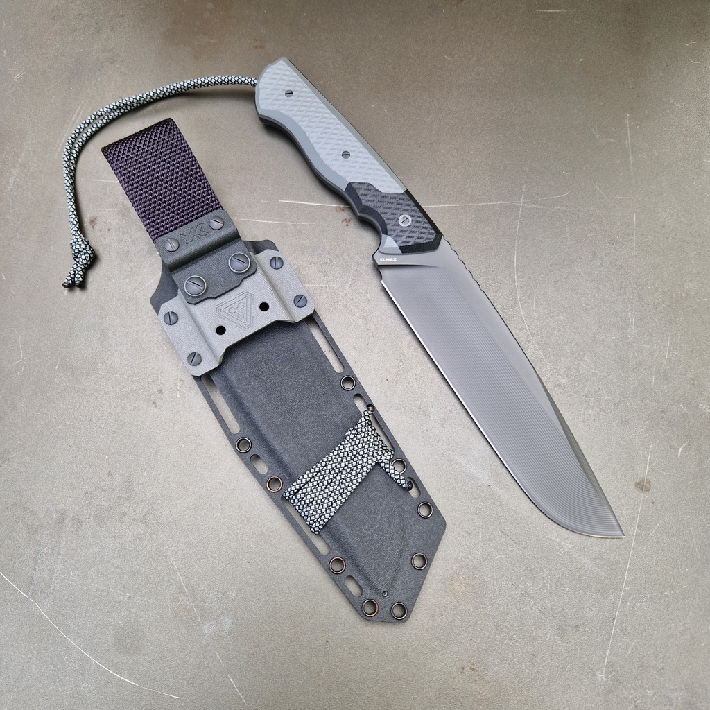 Nóż MK Knives & Tools Crowbar „FuturePunk” w prezentowanej wersji posiada ostrze ze świetnej stali Elmax. Ostrze wykonano z innowacyjnym, delikatnie wklęsłym szlifem, widocznym jako subtelne rowki. Takie połączenie daje niesamowitą wytrzymałość narzędzia przy zachowaniu świetnych właściwości tnących. Głownię pokryto czarną powłoką DLC a rękojeść wykonano z szarego kompozytu G10 z czarnymi wstawkami z tego samego materiału. W zestawie dostarczana jest kabura z czarnego tworzywa Kydex.