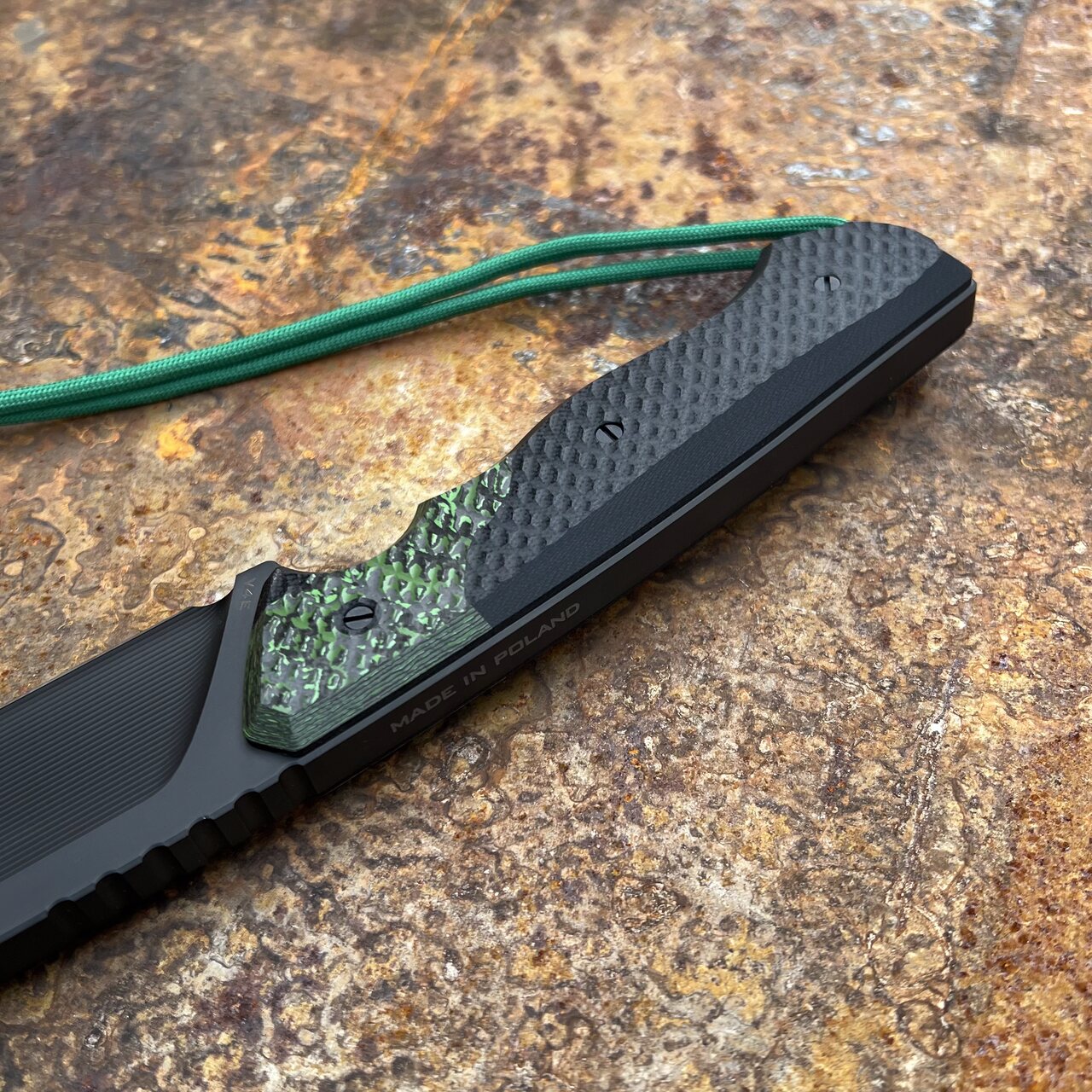 - Rękojeść: czarny kompozyt G10 + wstawki z włókna węglowego FatCarbon Jungle Wear