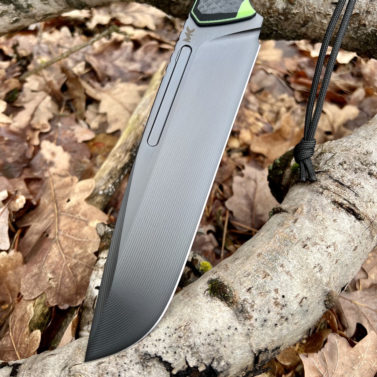 Nóż MK Knives & Tools Crowbar „HGF2T #2” posiada ostrze ze stali Elmax z głownią o grubości 6,5 mm na grzbiecie. Ostrze wykonano z innowacyjnym, delikatnie wklęsłym szlifem, widocznym jako subtelne rowki. Takie połączenie daje niesamowitą wytrzymałość narzędzia przy zachowaniu świetnych właściwości tnących. Głownię pokryto powłoką DLC a rękojeść wykonano z jasno zielonego kompozytu (toxic green) G10 z czarnymi wstawkami i przekładkami (linersy). W zestawie otrzymujemy kaburę z tworzywa Kydex z tekstylną przelotką w kolorze czarnym oraz dodatkową klamrę z Kydexu służącą do podpięcia noża do rozwiązań typu MOLLE.