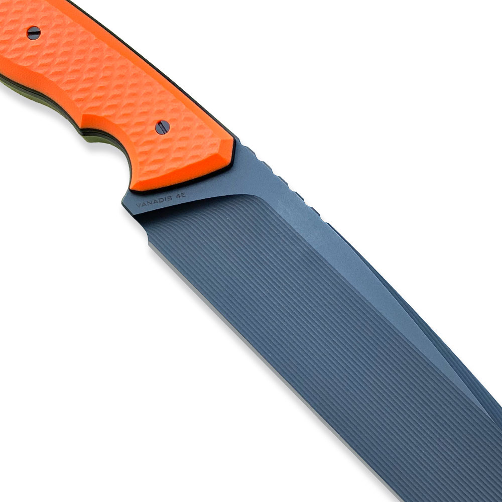 Nóż MK Knives & Tools Crowbar „Orange Fist” posiada ostrze ze stali Vanadis 4 Extra z głownią o imponującej grubości aż 9 mm na grzbiecie (!). Ostrze wykonano z innowacyjnym, delikatnie wklęsłym szlifem, widocznym jako subtelne rowki. Takie połączenie daje niesamowitą wytrzymałość narzędzia przy zachowaniu świetnych właściwości tnących. Głownię pokryto czarną powłoką PVD a rękojeść wykonano z pomarańczowego kompozytu G10 z czarnymi przekładkami (linersy). W zestawie otrzymujemy kaburę z tworzywa Kydex w kolorze czarnym oraz dodatkową klamrę z Kydexu służącą do podpięcia noża do rozwiązań typu MOLLE.