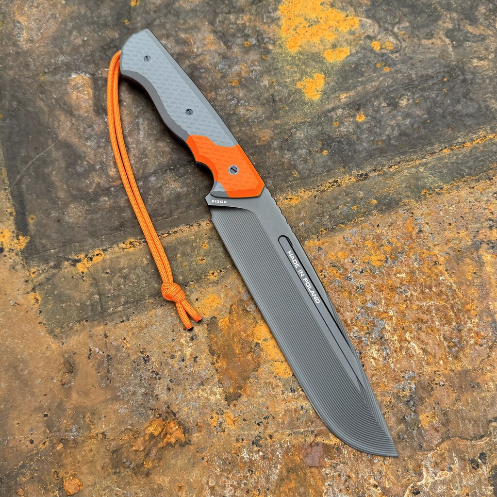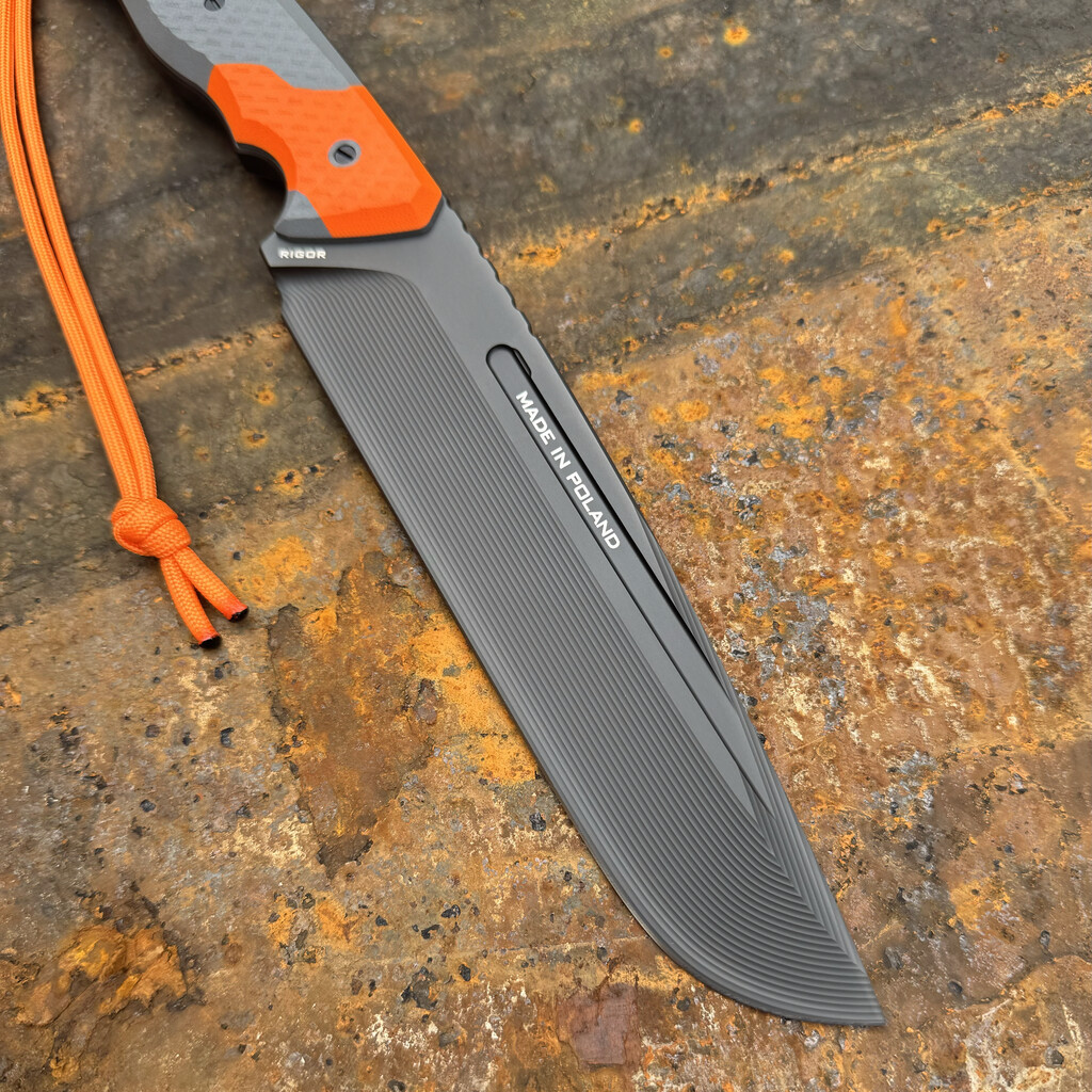 Nóż MK Knives & Tools Crowbar „Postapo” w prezentowanej wersji posiada ostrze ze stali Rigor z grzbietem o imponującej grubości aż 8 mm (!). Ostrze wykonano z innowacyjnym, subtelnie wklęsłym szlifem. Takie połączenie daje niesamowitą wytrzymałość narzędzia przy zachowaniu świetnych właściwości tnących. Okolicę grzbietową ostrza wyróżnia dodatkowo obustronne zbrocze (fuller), które płynnie przechodzi w ostrze fałszywe (typ zbrocza zastosowany po raz pierwszy!). Głownię pokryto czarną powłoką DLC a rękojeść wykonano z szarego G10 z wstawkami w pomarańczowej kolorystyce. W zestawie dostarczana jest kabura z szarego tworzywa Kydex.