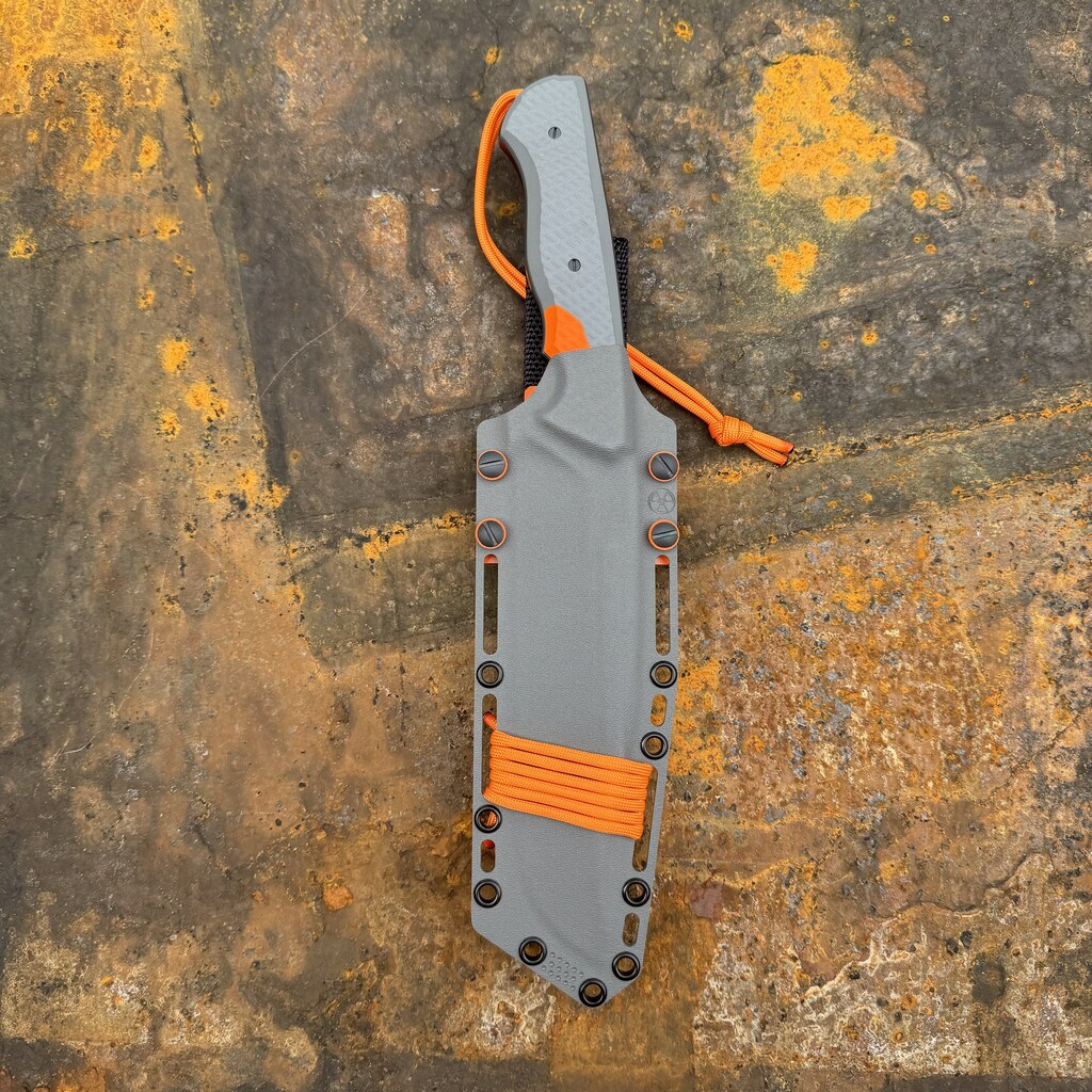 - Rękojeść: szary kompozyt G10 + pomarańczowe wstawki (inserts)