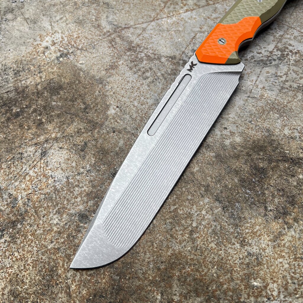 Nóż MK Knives & Tools Crowbar „Postapo” w prezentowanej wersji posiada ostrze ze świetnej stali Elmax. Ostrze wykonano z innowacyjnym, delikatnie wklęsłym szlifem, widocznym jako subtelne rowki a jego sztych charakteryzuje szlif płaski uwydatniający zdolności penetracyjne noża. Takie połączenie daje niesamowitą wytrzymałość narzędzia przy zachowaniu świetnych właściwości tnących. Okolicę grzbietową ostrza wyróżnia dodatkowo obustronne zbrocze (fuller). Głownię wykończono w stylistyce „postapo stonewashed” a rękojeść wykonano z oliwkowego G10 z pomarańczowymi wstawkami z tego samego materiału. W zestawie dostarczana jest kabura z oliwkowego tworzywa Kydex.