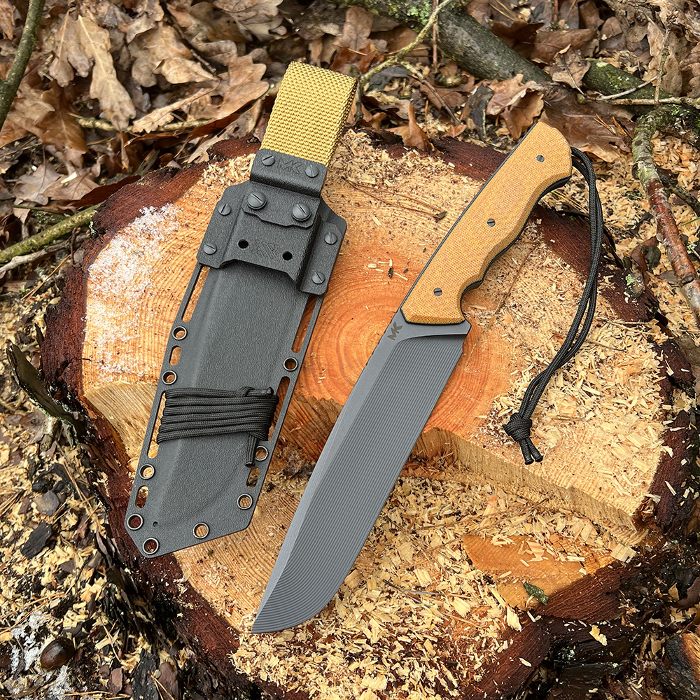 Nóż MK Knives & Tools Crowbar „Sawdust” posiada ostrze ze stali Vanadis 4 Extra z głownią o imponującej grubości aż 9 mm na grzbiecie (!). Ostrze wykonano z innowacyjnym, delikatnie wklęsłym szlifem, widocznym jako subtelne rowki. Takie połączenie daje niesamowitą wytrzymałość narzędzia przy zachowaniu świetnych właściwości tnących. Głownię pokryto czarną powłoką PVD a rękojeść wykonano z naturalnej micarty (Natural Canvas Micarta) z czarnymi przekładkami (linersy). W zestawie otrzymujemy kaburę z tworzywa Kydex w kolorze czarnym oraz dodatkową klamrę z Kydexu służącą do podpięcia noża do rozwiązań typu MOLLE.