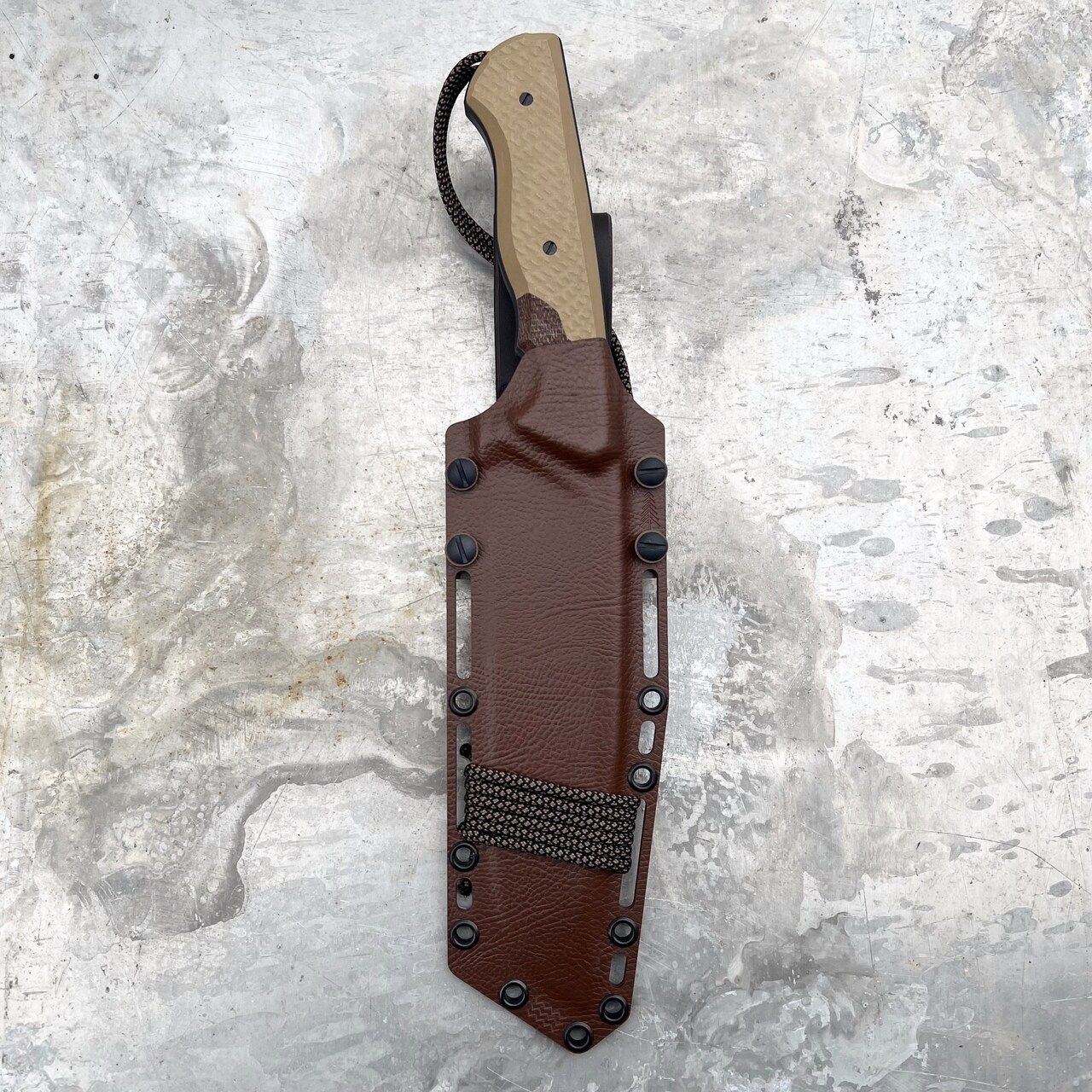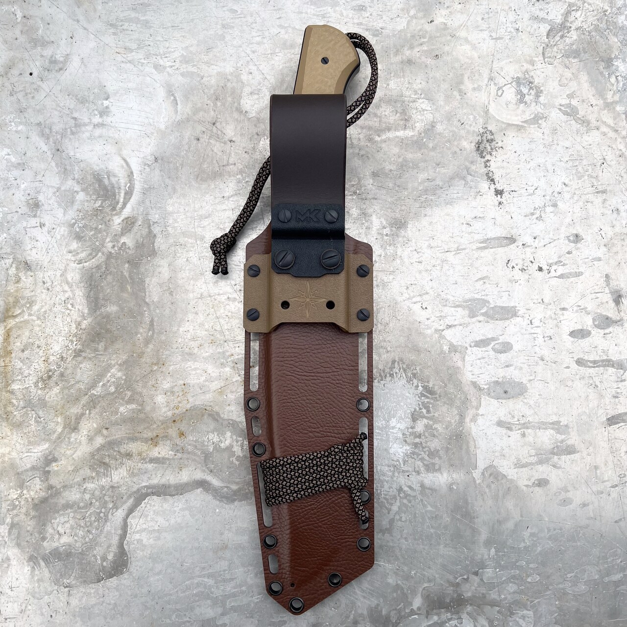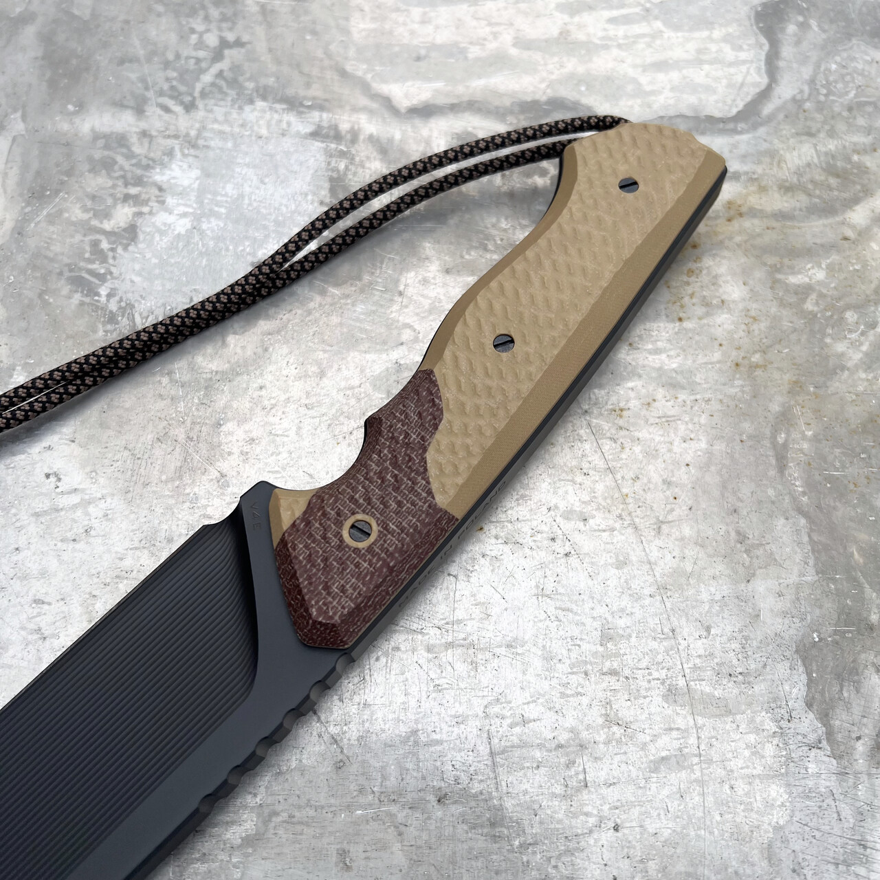 - Rękojeść: kompozyt G10 w kolorze Coyote + wstawki z customowej brązowej micarty