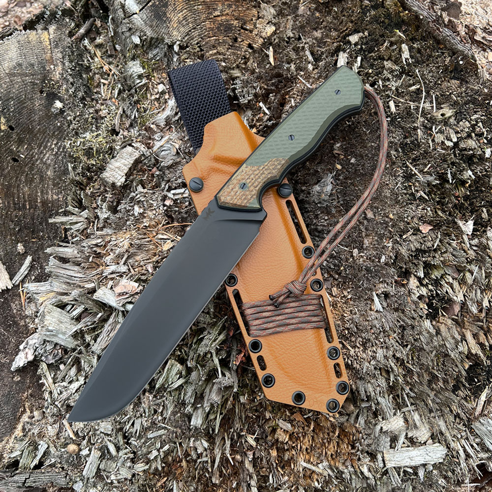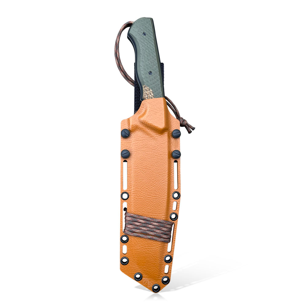 Nóż posiada kaburę z ręcznie formowanego tworzywa holstex cechującego się wysoką odpornością na uderzenia, zarysowania, charakteryzującego się niską chłonnością wilgoci, odpornego na różnorodne warunki atmosferyczne oraz wiele środków chemicznych. W prezentowanym modelu kabura zrobiona została z materiału w dobranym przez wykonawcę kolorze oraz uzupełniona dobranymi do projektu dodatkami kolorystycznymi.