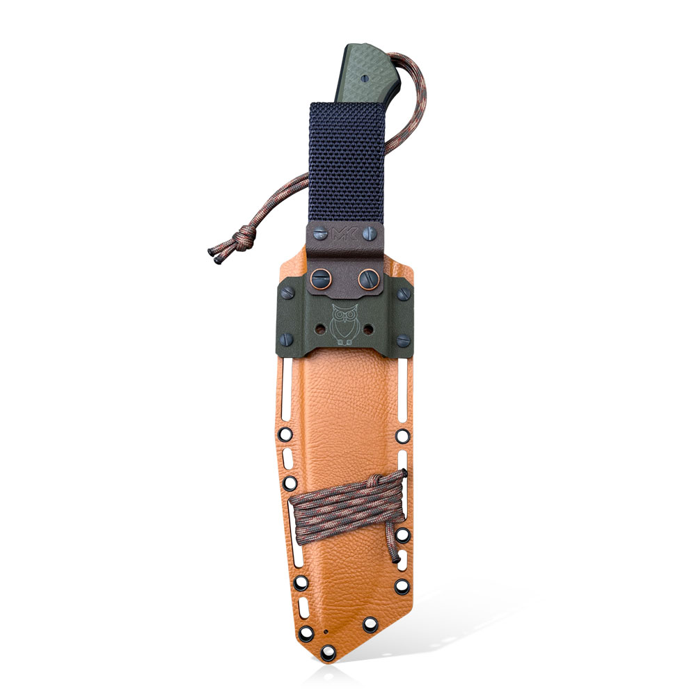 Nóż MK Knives & Tools Crowbar „Wood Spirit III” posiada ostrze ze stali premium Elmax pokryte powłoką DLC o świetnej twardości. Okładziny rękojeści wykonane zostały z zielonego kompozytu G10 z czarnymi przekładkami z tego samego materiału oraz ze wstawkami z drewna stabilizowanego. W zestawie z nożem otrzymujemy kaburę z tworzywa holstex w kolorze coyote i dodatkami z kydexu w czerni, brązie i zieleni. W zestawie otrzymujemy również dodatkową, autorską klamrę z kydexu służącą do podpięcia noża do rozwiązań typu MOLLE. W designie kabury wyróżniają się piktogramy wygrawerowane na kaburze (sowa, grzyby, liść) podkreślające przeznaczenie noża – używanie na łonie natury.