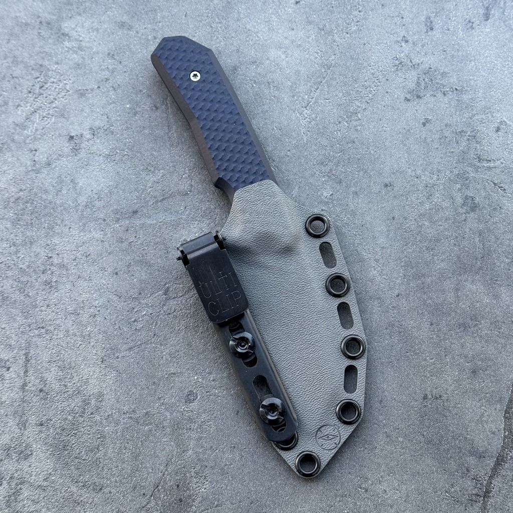 - Dodatkową możliwość personalizacji sposobu przenoszenia daje klamra kątowa zaprojektowana przez twórcę, która pozwala na przenoszenie noża w kaburze na pasku pod wybranym kątem, w sposób mniej lub bardziej dyskretny. Klamrę można zamówić TUTAJ.