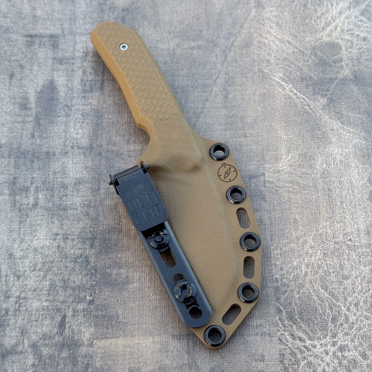 - Pokrowiec: jasnobrązowa kabura Kydex (coyote) z klipsem UltiClip Slim 3.3.